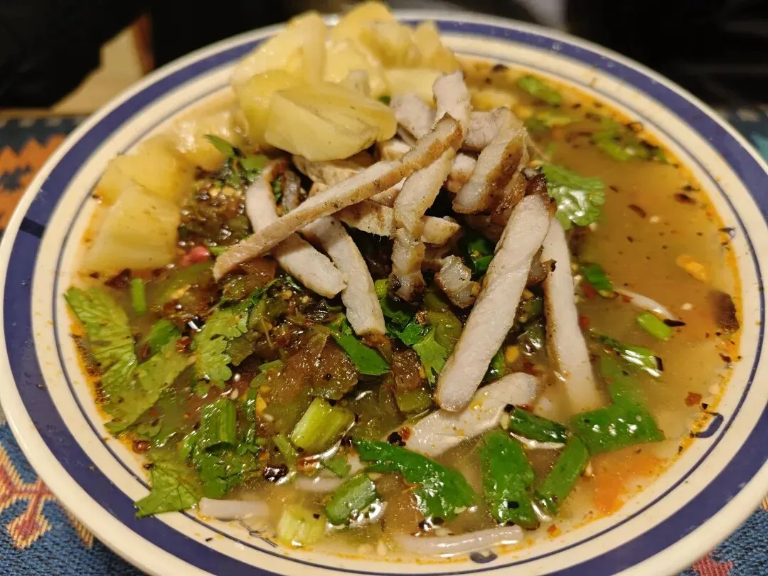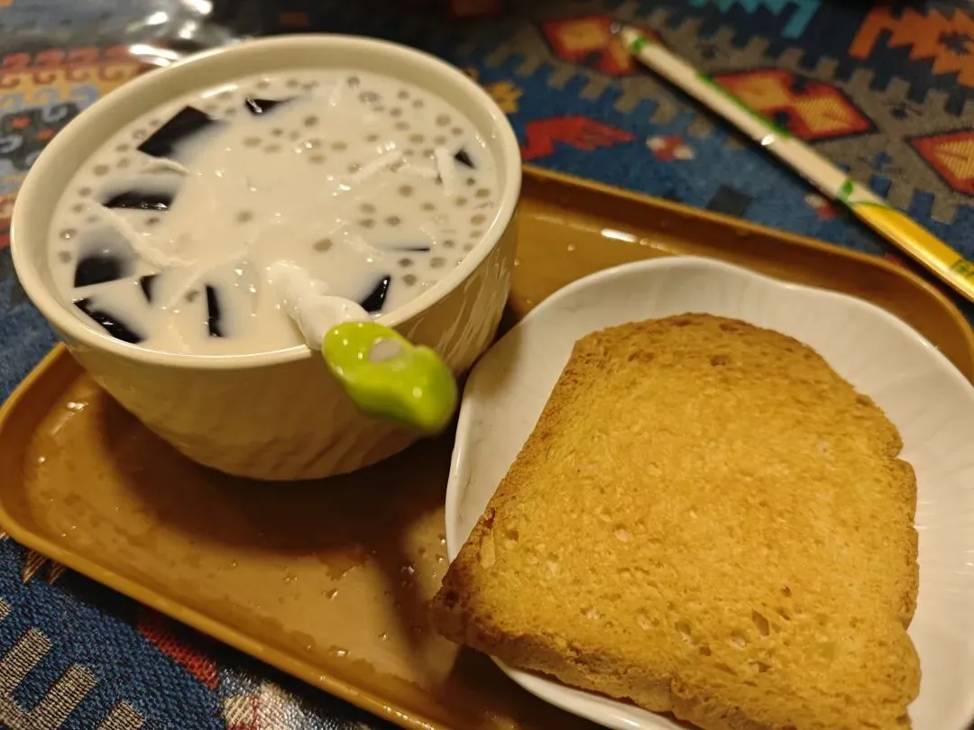 老固东番茄火烧肉米线的番茄,辣椒和肉都是碳烤的,整碗米线囊括了浓厚的炭香味,很特别。泡鲁达是加了红豆,西米和龟苓膏的椰奶小糖水,糖霜面包干泡一泡吃。温泉土豆和卤味鹌鹑蛋是酒店给的,硫磺味的,土豆又甜又粉,蛋很入味。以后可以买点鹌鹑蛋和土豆自己来煮。