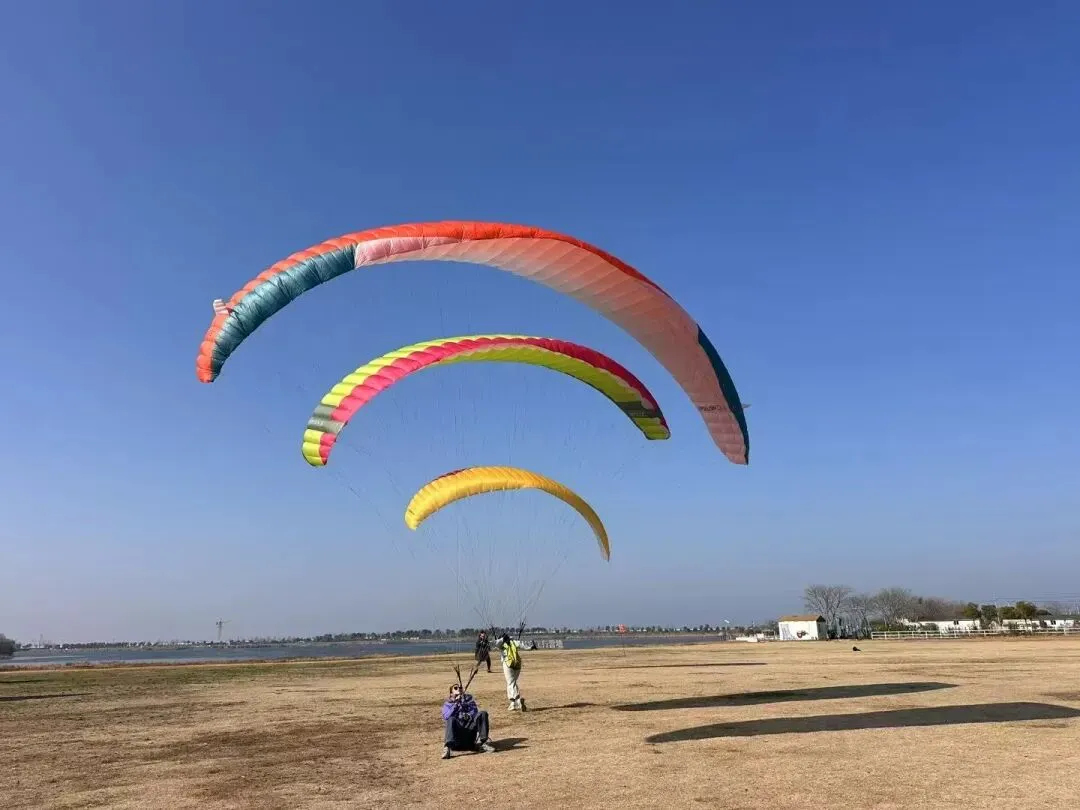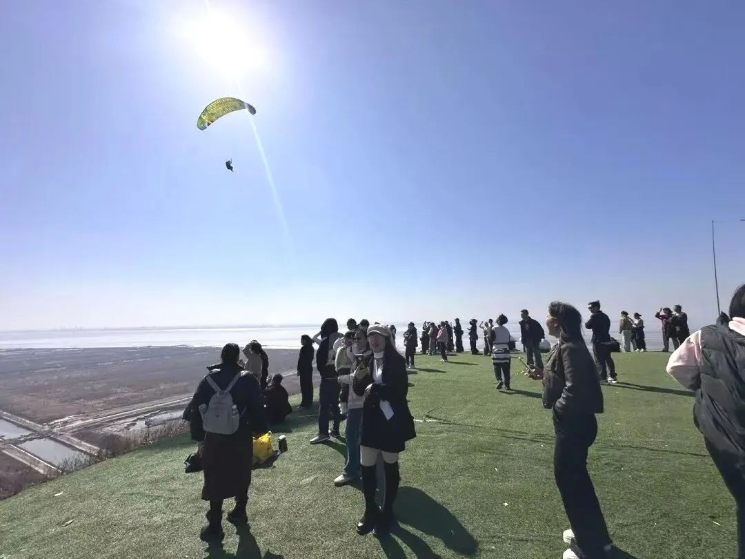 春节期间,滑翔伞持续火热。游客从山顶起飞,俯瞰山海田野,在蓝天之上迎接。