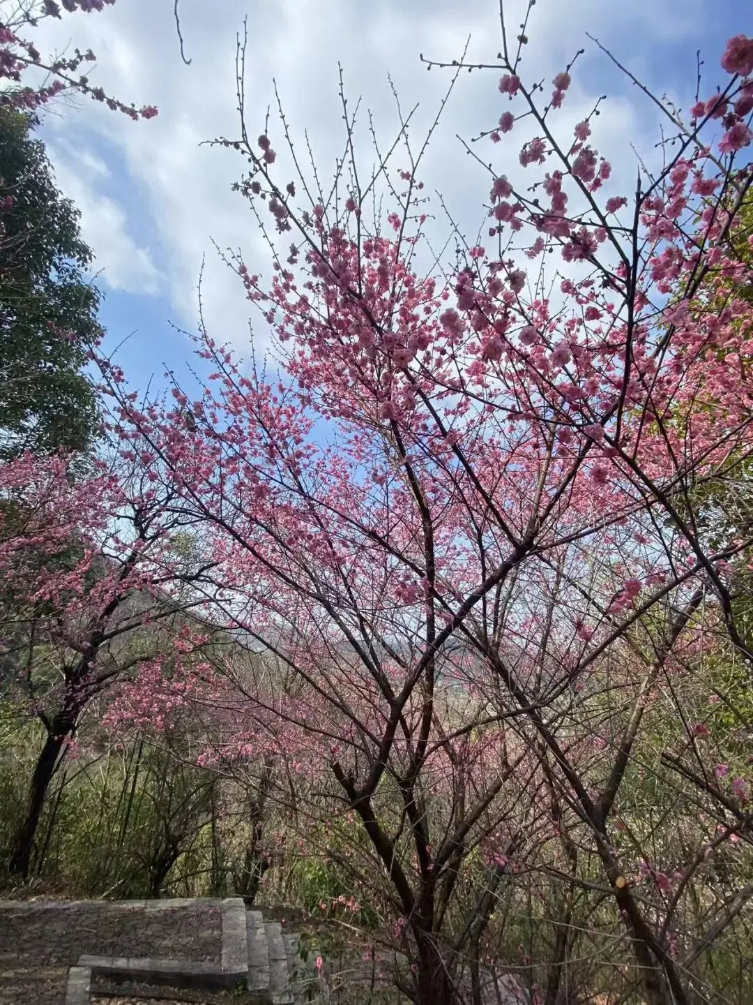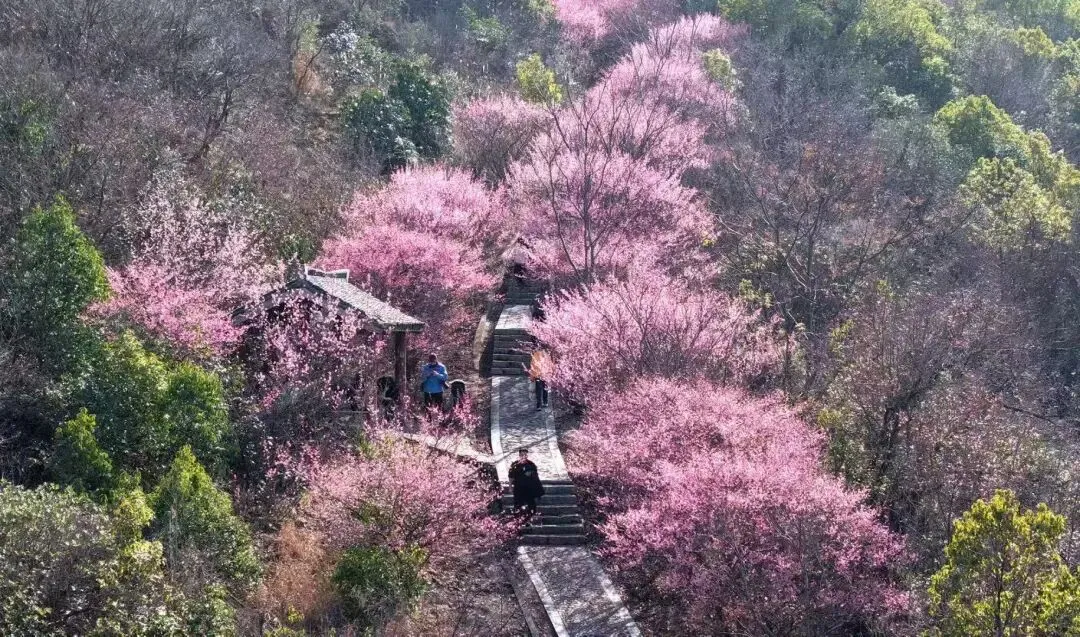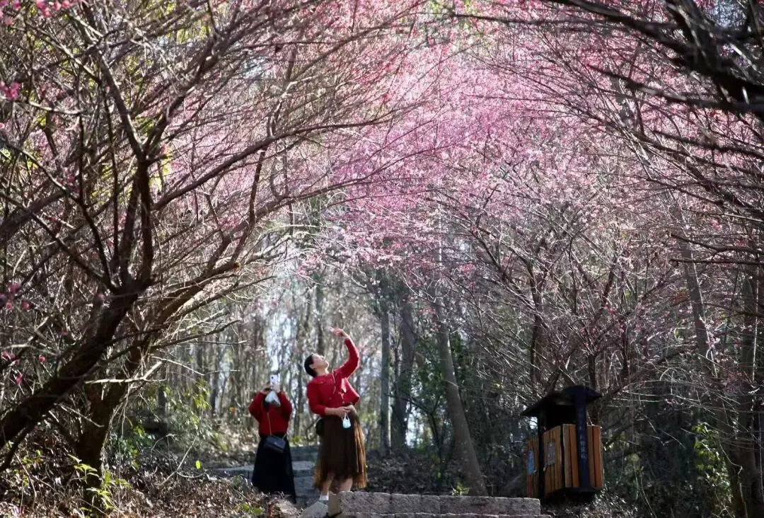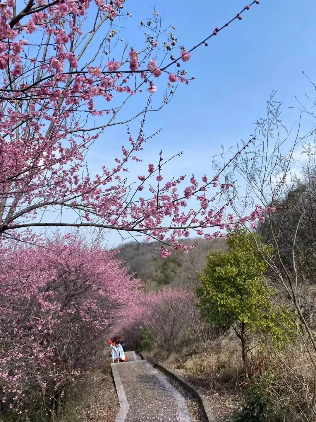 春节期间正值梅花初放,大尖山步道成为游客拍照打卡的热门地点。沿步道漫步,花香淡雅,春意渐浓,为假日出游增添了一份诗意与浪漫。
