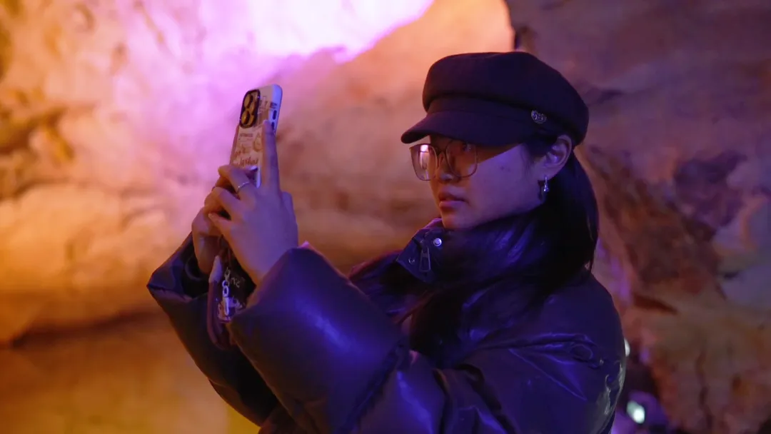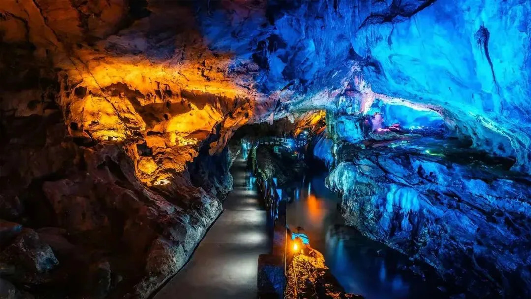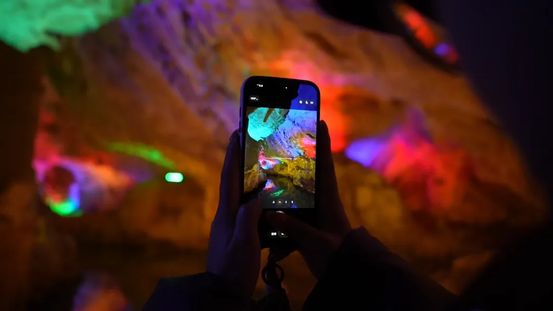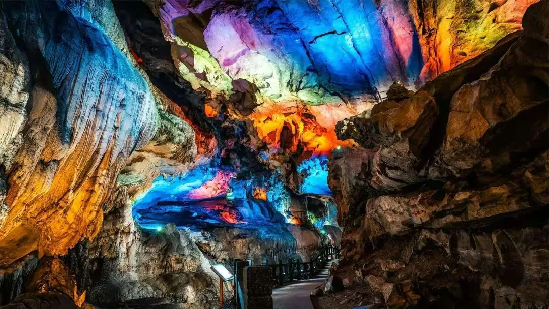作为仍在发育中的大型地下河溶洞,万华岩的稀缺性正在于"活"——洞内恒温18℃,地下河终年流淌,钟乳石以每百年数厘米的速度持续生长。五彩灯光映照下,石笋、石柱、石幔千姿百态,游客穿行其间,恍若置身流动的地质博物馆。来自广东佛山的游客黄琬淇,就被洞内独特的乳石景观深深震撼。