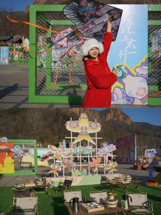 东太行景区内同样热闹非凡,处处洋溢着新春的喜庆氛围。景区紧扣年轻态、个性化定位,精心打造风筝主题户外生活节,特色景观布置、休闲体验区、创意风筝市集逐一亮相。春风拂面,游客们携亲伴友、放飞风筝,在奇峰峻岭间尽览太行春日盛景。