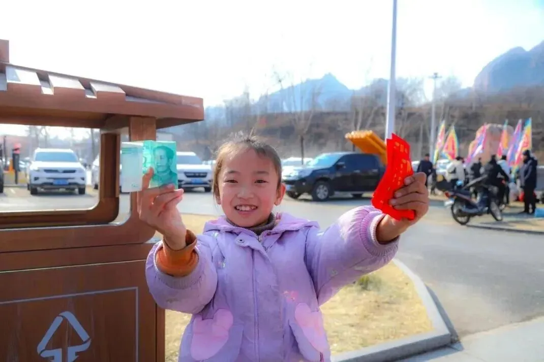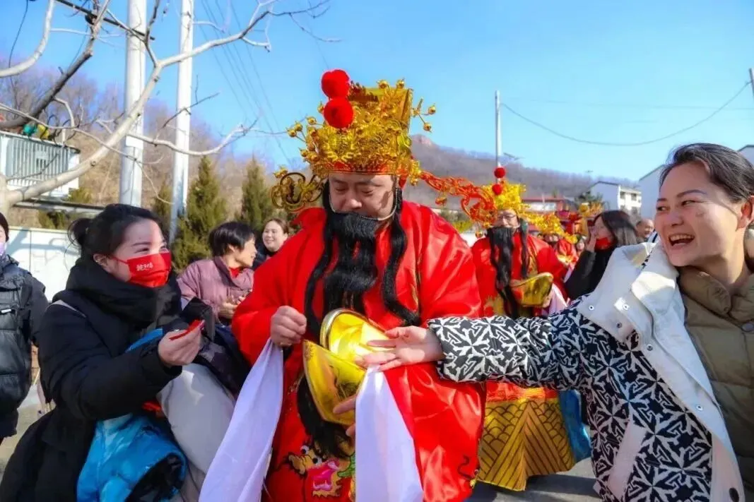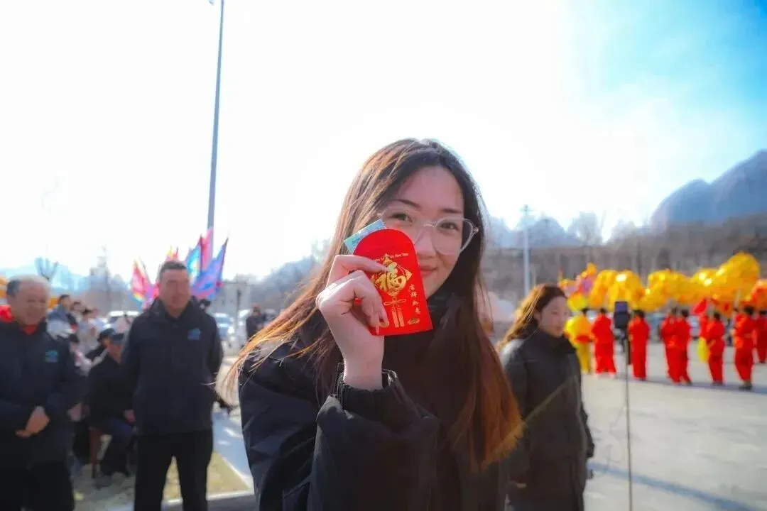 白天,由NPC扮演的“五路财神”身着锦袍、手持元宝福袋,在山间巡游送福,沿途派发现金红包,游客们争相上前“接福纳祥”,孩子们兴奋地追着队伍奔跑欢笑,太极广场抽签打卡点前排起长队,处处洋溢着团圆喜乐的氛围。