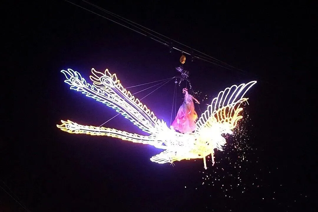 夜幕降临,景区华灯璀璨,“飞天凤凰”大型光影秀六场循环上演,金色巨凤翱翔夜空、流光溢彩,点点光屑如天女散花,为游客带来梦幻般的视觉盛宴。