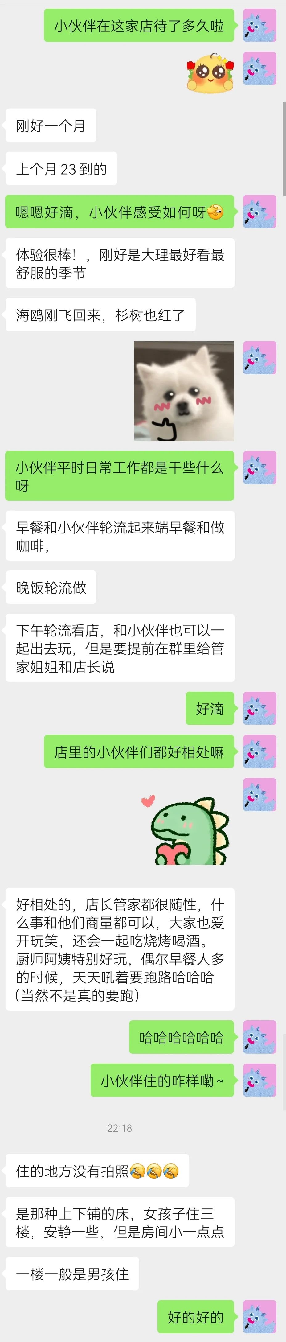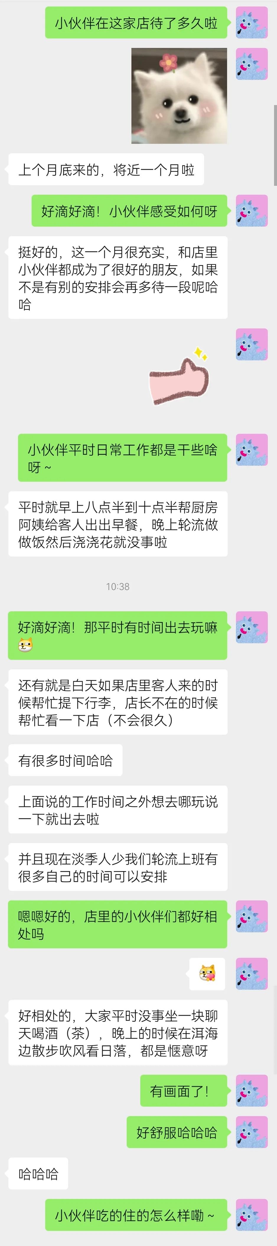 工作内容:早上帮忙给客人端下早餐收下桌,浇花,维护好公区卫生,轮流做做晚饭,忙不过来的时候帮助客房送些东西,店长不在的时候帮忙看看店