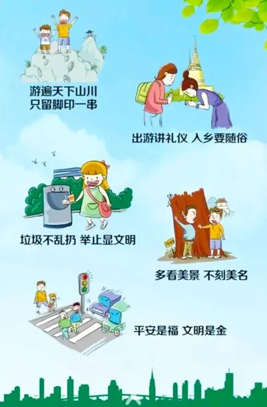 一、在旅游景区不乱扔果皮、纸屑等废弃物,不乱倒垃圾、污水。在文物建筑上不乱攀乱踏、乱刻乱画。