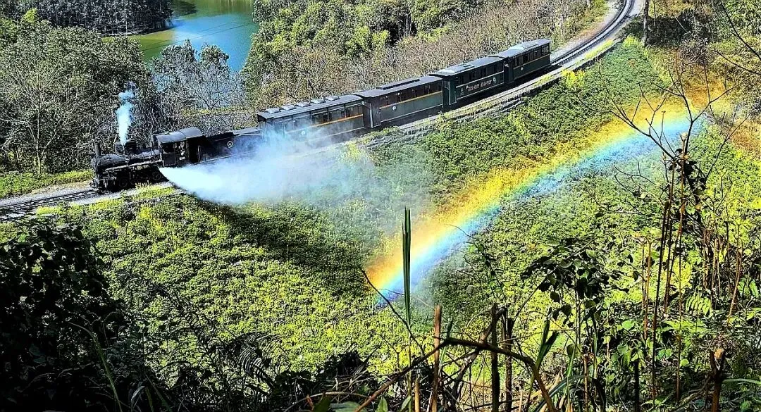阳光穿透密集的小水珠,瞬间出现清晰的七彩虹影,横跨铁轨与青山间,伴随着震天的汽笛声,蒸汽彩虹非常壮观!