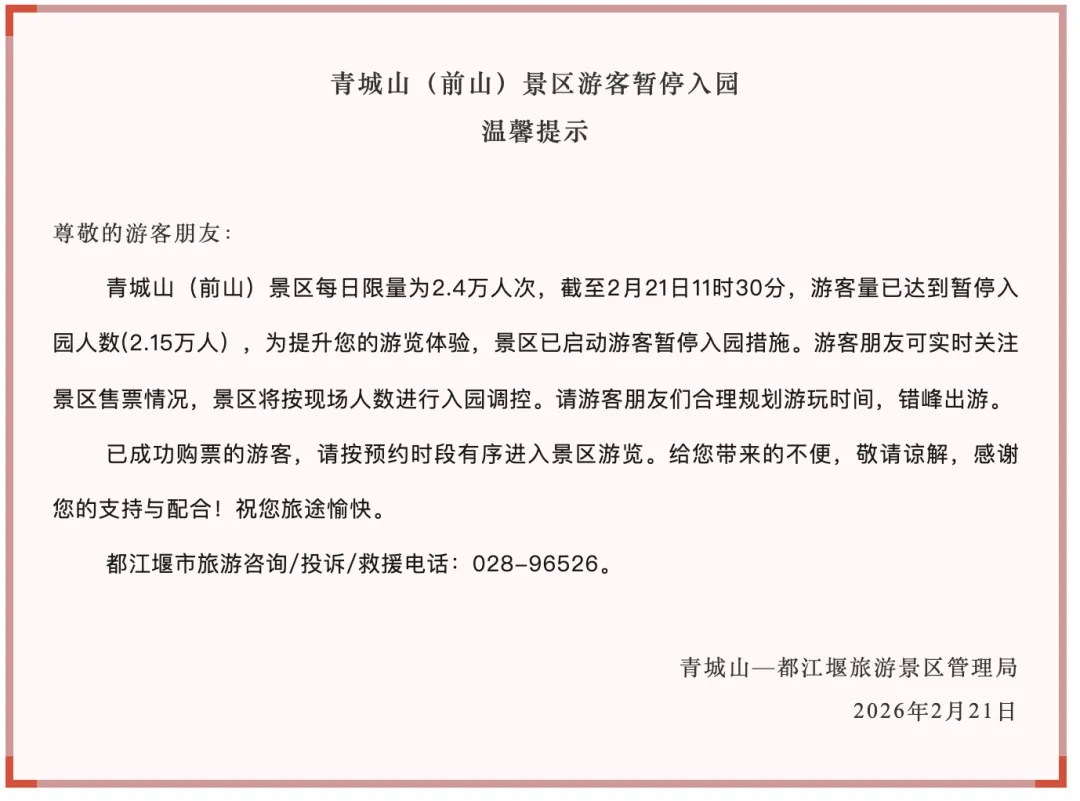 青城山(前山)景区每日限量为2.4万人次,截至2月21日11时30分,游客量已达到暂停入园人数(2.15万人),为提升您的游览体验,景区已启动游客暂停入园措施。游客朋友可实时关注景区售票情况,景区将按现场人数进行入园调控。请游客朋友们合理规划游玩时间,错峰出游。