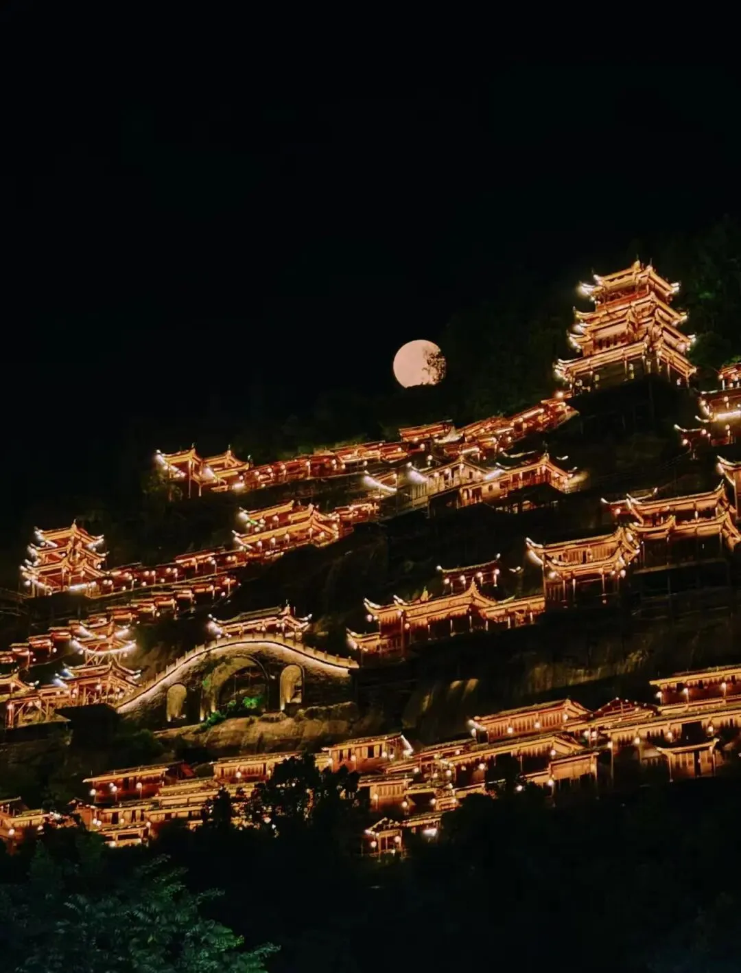 夜幕降临后,景区灯光亮起,古色古香的建筑搭配灯光,宛如闯入童话世界。