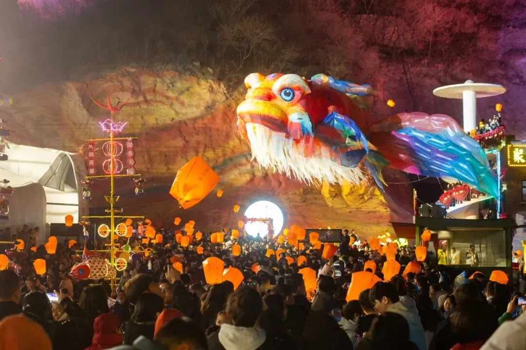 烟火与非遗在这里共生!红叶柿岩的鳌鱼巡游金鳞闪耀,非遗药发木偶惊艳夜空;新甫山的大花轿穿越古今,非遗百兽图再现老祖宗的绝活;济南电影幻城的巨型糖葫芦树与“天女散花”,点燃了所有人的少女心。
