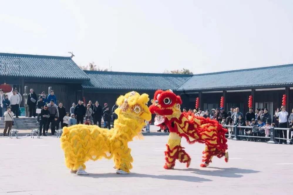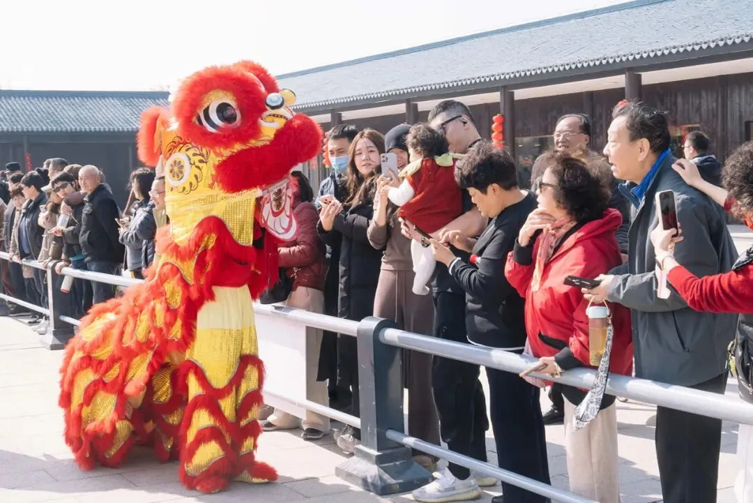 热闹非凡的醒狮演艺在景区内穿梭巡游