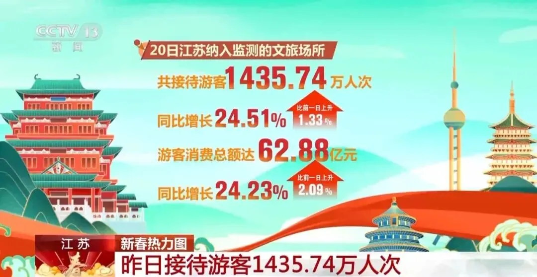 春节假期第六天,江苏全省纳入监测的文旅场所共接待游客1435.74万人次,游客消费总额达62.88亿元,同比2025年分别增长24.51%和24.23%,比前一日分别上升1.33%和2.09%。