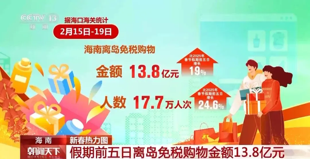 据海口海关统计,2月15日—19日,海南离岛免税购物金额、人数分别为13.8亿元、17.7万人次,比去年春节假期前五天分别增长19%、24.6%。