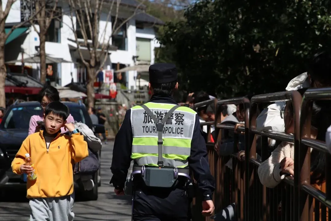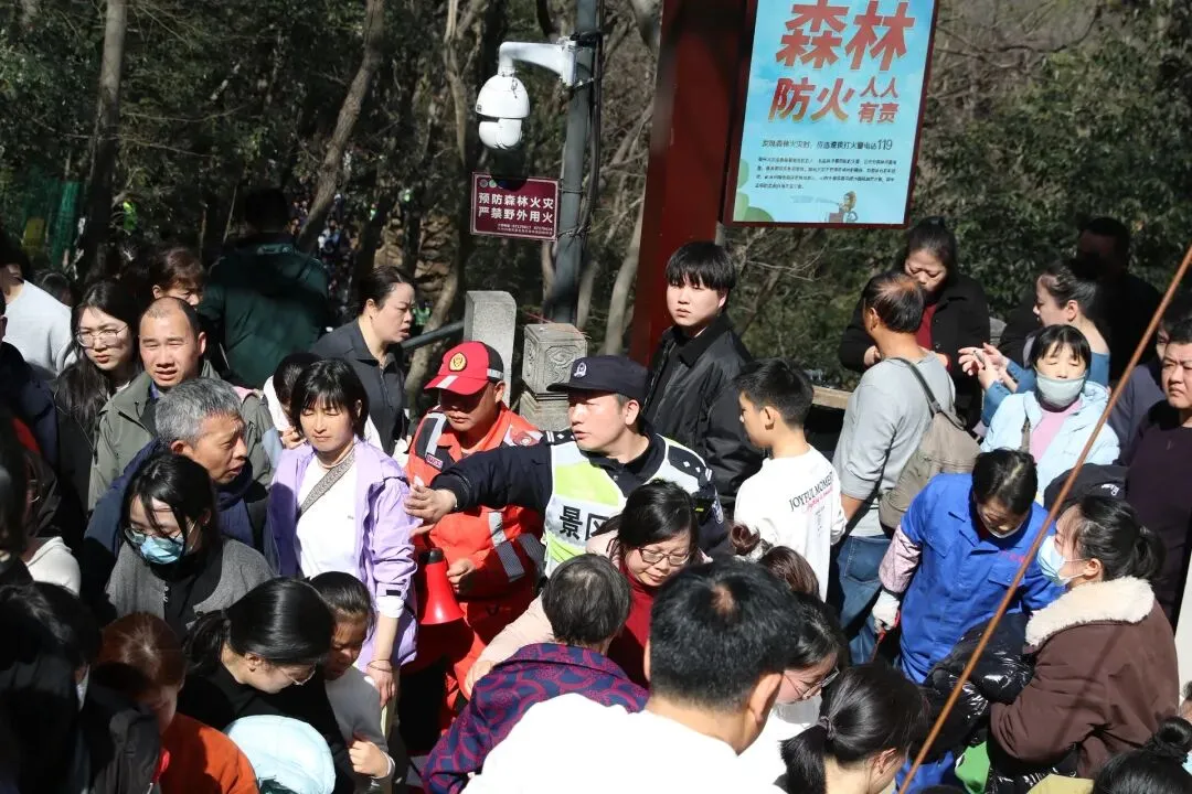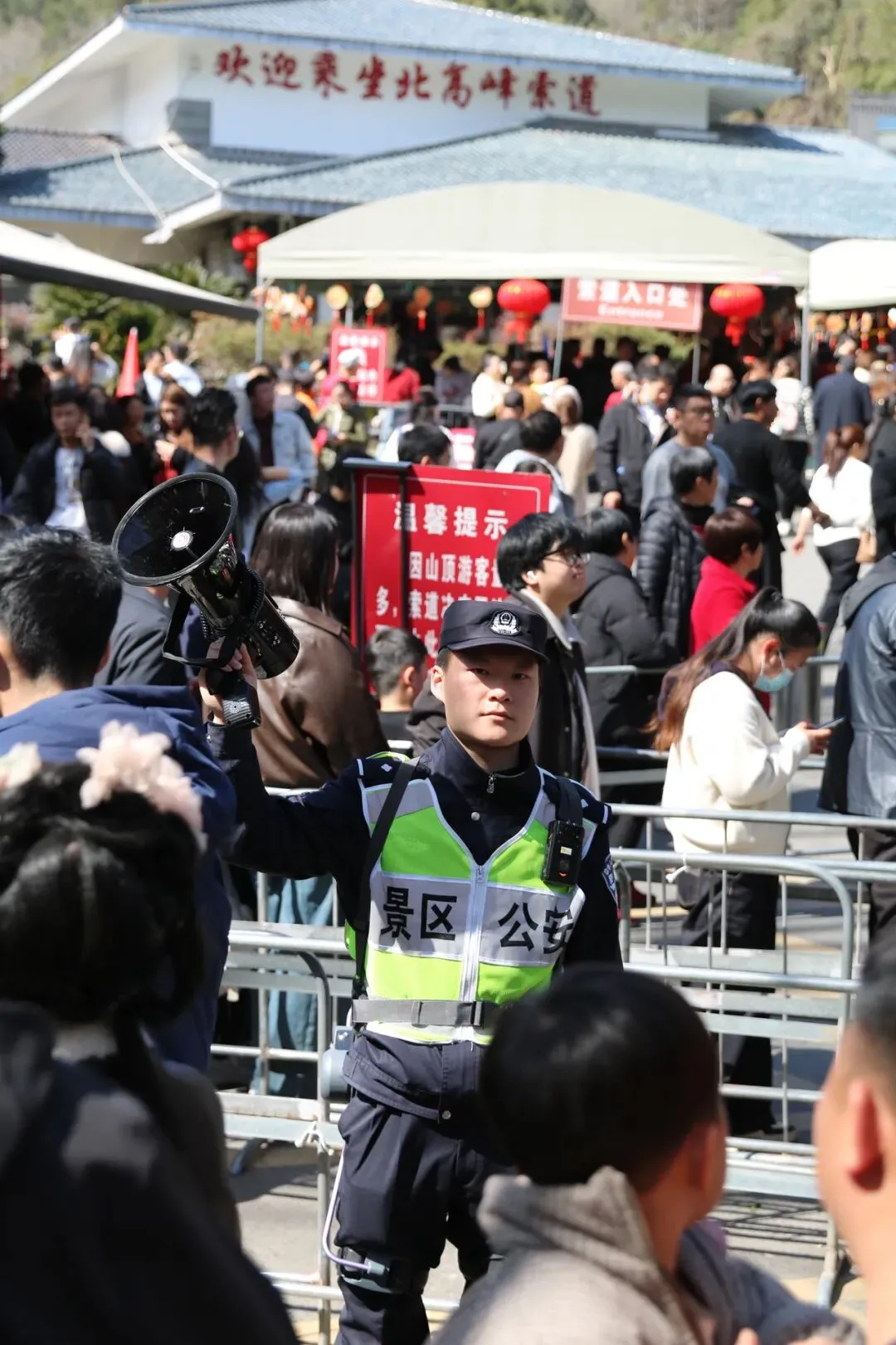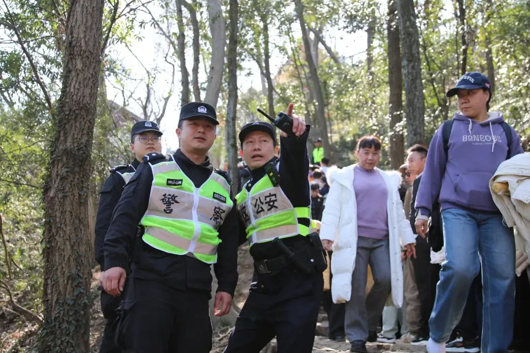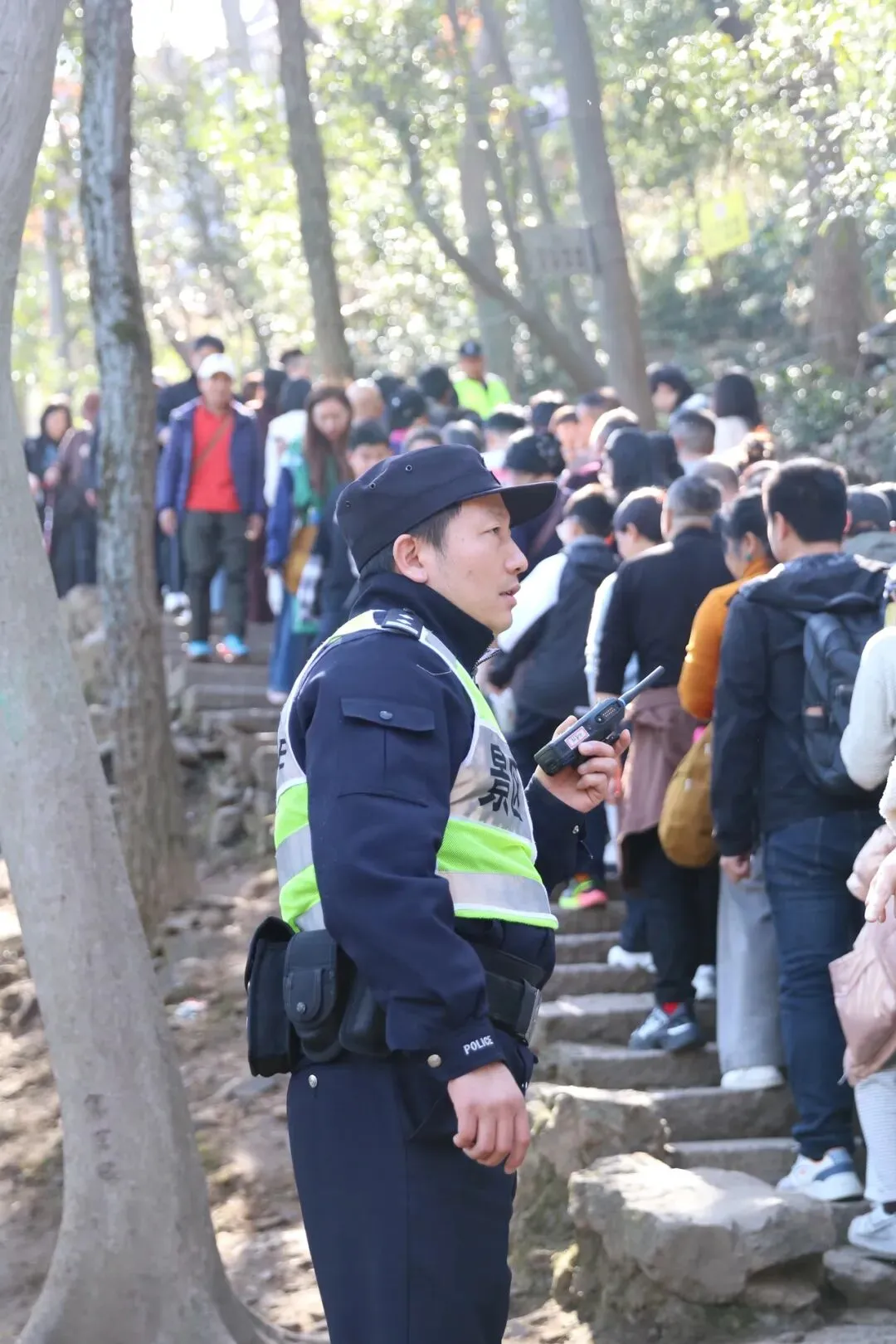 “大家不要挤,慢慢走,注意脚下!”“请往这边分流,有序上山!”民警、辅警手持扩音喇叭,穿梭在人群中,一遍遍喊着。遇到拥堵节点,他们手拉手站成人墙,把涌动的人潮一点点“削”成可控的波浪。孩子走失的哭声,总在人最多的时候响起。