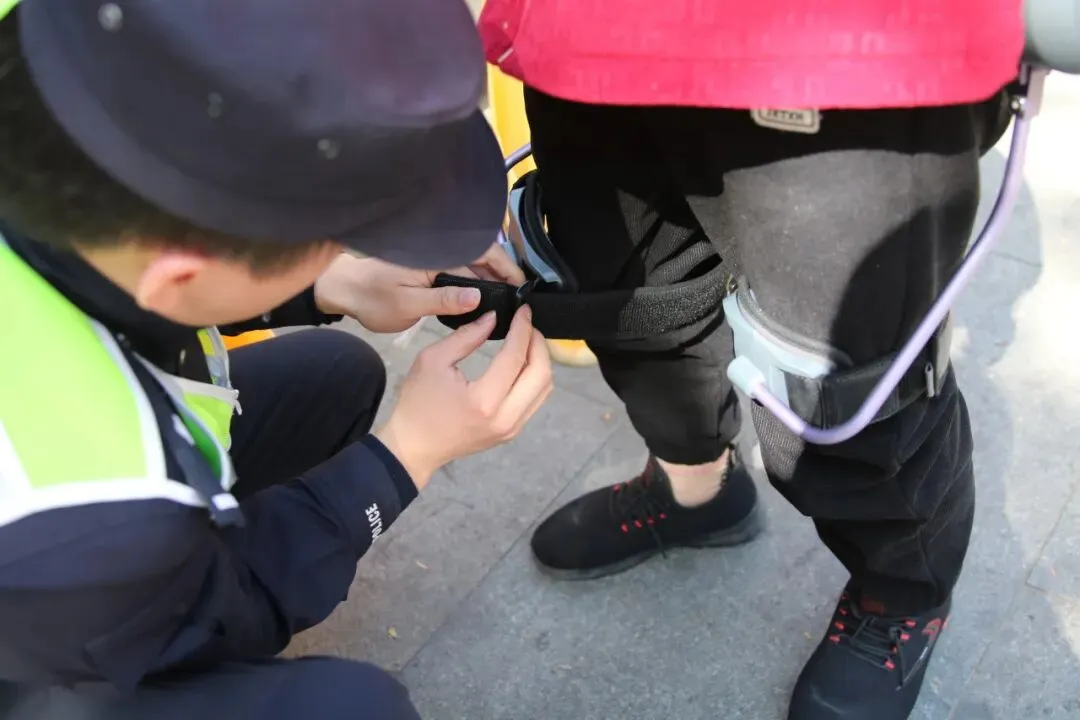 68岁的王阿姨没想到,自己能在去财神庙的台阶上走得这么稳。那天她走得有些吃力,民警见状,主动帮她穿上外骨骼。对齐髋部、固定受力带,几公斤重的设备穿好,阿姨先在平地试了两步,又试着上了几级台阶。
