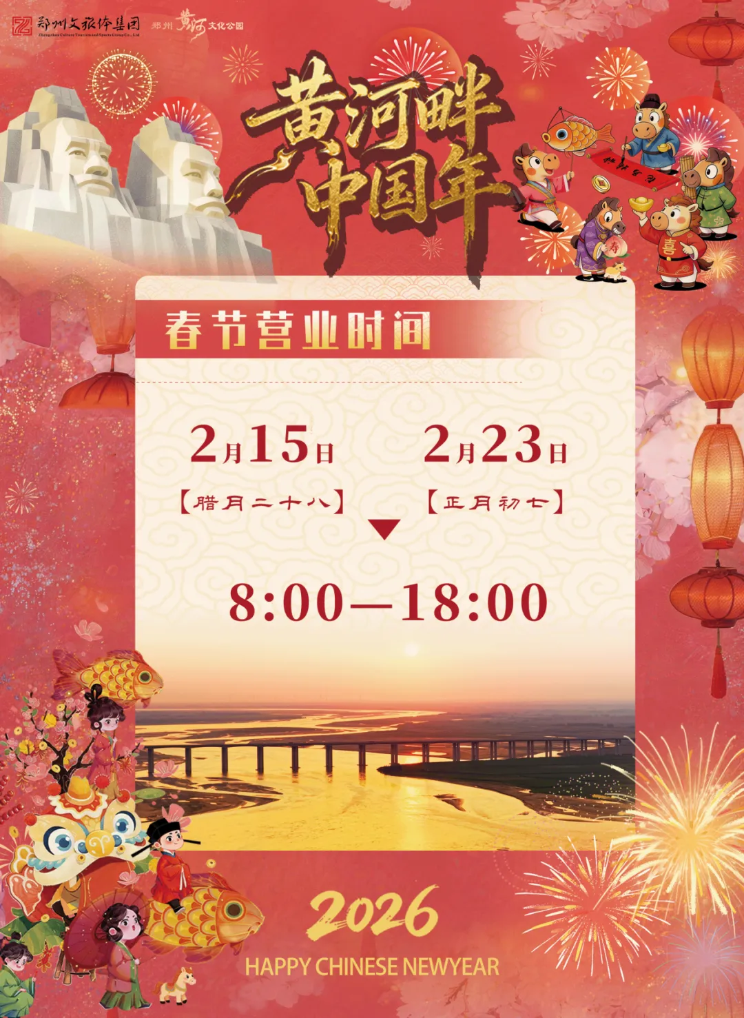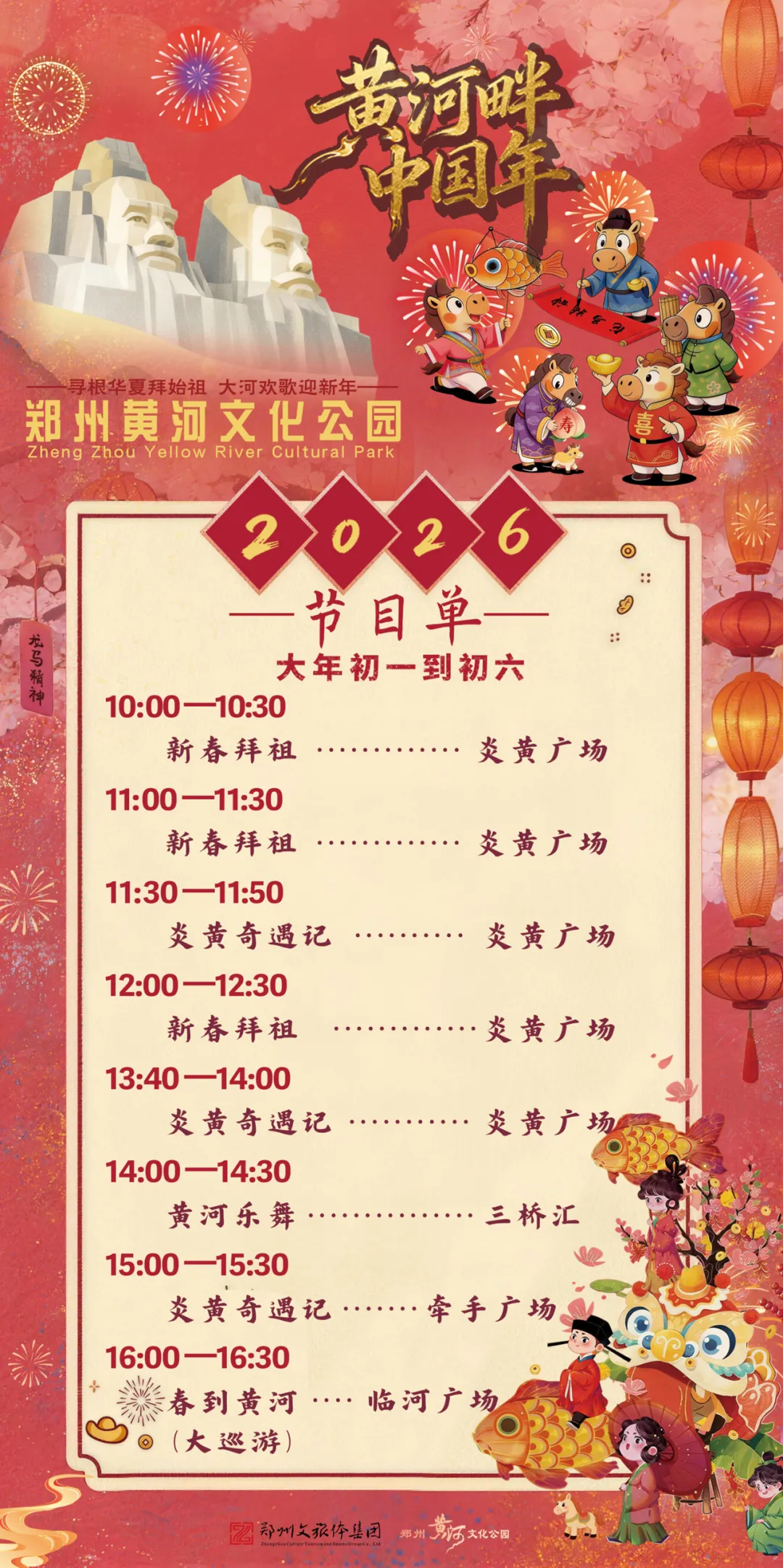 郑州黄河文化公园能玩的可太多了!我们春节准备了超丰富的新春活动,拜祖仪式、炎黄奇遇记、春到黄河大巡游......您还可以瞻仰高达106米的炎黄二帝巨型雕像,近距离观赏黄河的波澜壮阔,参观黄河地质博物馆,还可以在黄河碑林欣赏历代书法名家墨宝,甚至亲手装一瓶黄河水留作纪念~