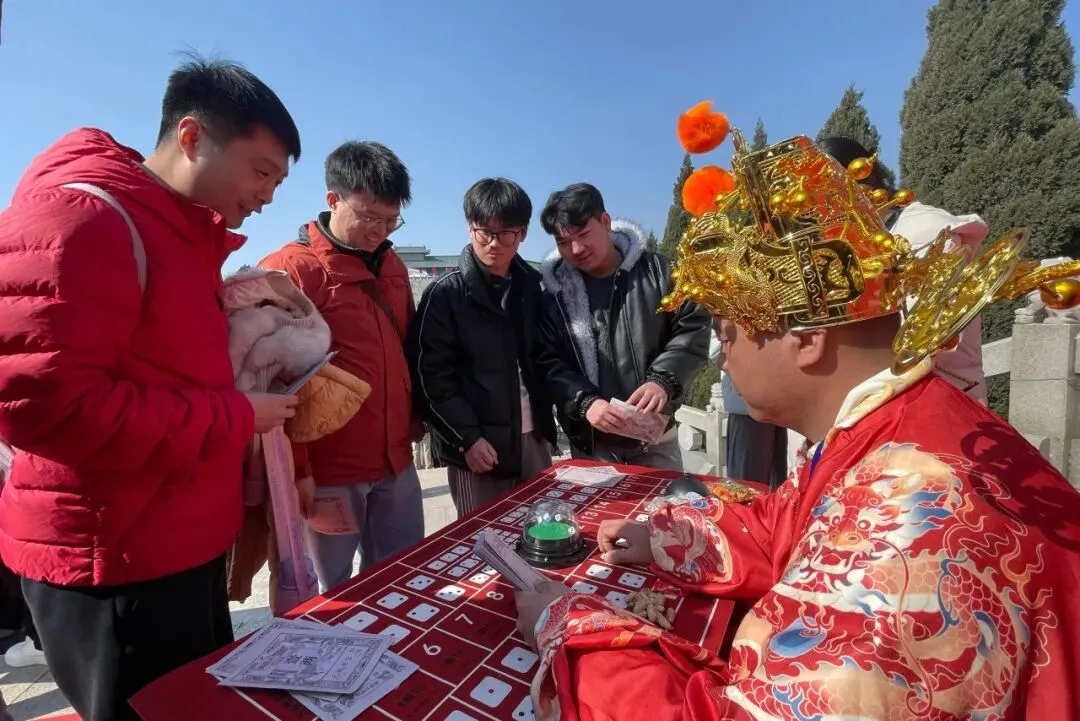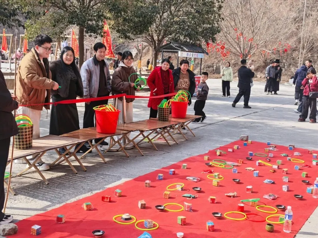 朝阳山景区,商王带队巡游送福,非遗表演燃爆现场,喝彩声此起彼伏。投壶、射礼、百福墙打卡、NPC 互动挑战等趣味游戏接连不断,玩游戏赢好礼,轻松解锁新年好彩头。