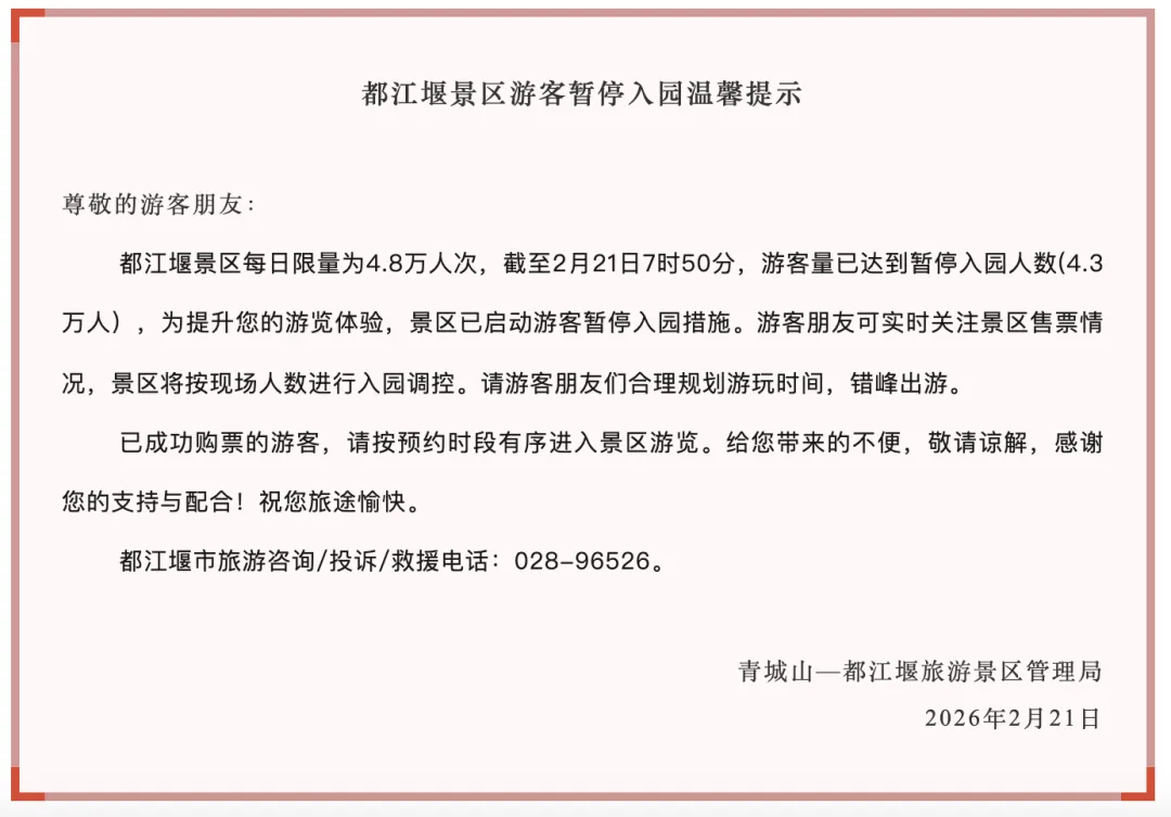 都江堰景区每日限量为4.8万人次,截至2月21日7时50分,游客量已达到暂停入园人数(4.3万人),为提升您的游览体验,景区已启动游客暂停入园措施。游客朋友可实时关注景区售票情况,景区将按现场人数进行入园调控。请游客朋友们合理规划游玩时间,错峰出游。