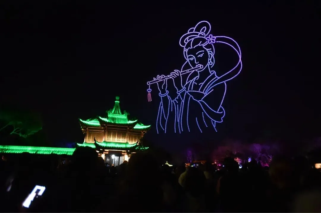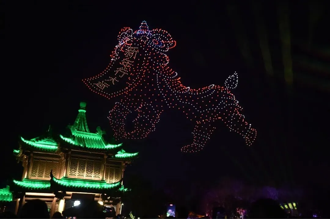正月初一到正月十五,无人机展演不定时地在瘦西湖、宋夹城等多地上空绚丽绽放,市民游客可以在光影流淌中感受扬州的独特魅力。
