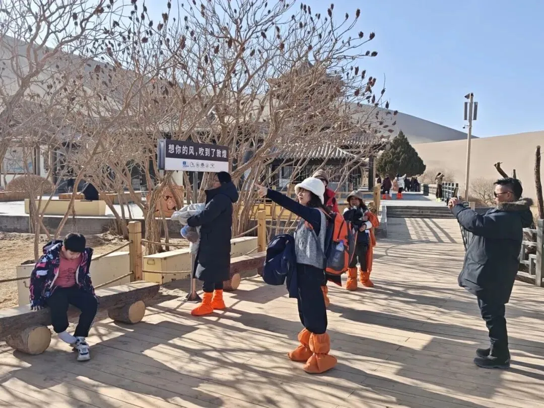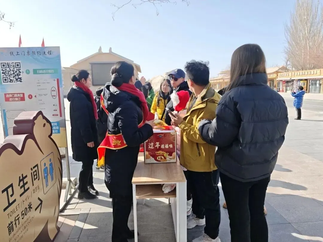 服务方面,景区在游客集中区域设置多个“暖心驿站”,免费供应姜茶、枣茶等热饮,为游客驱寒送暖。职工食堂也面向游客开放,提供平价可口的餐饮选择,让游客在领略沙泉奇观的同时,也能感受到贴心的照顾。游客中心入口处,工作人员佩戴笑脸标识,主动送上新春祝福;新设的入园抽奖环节,更为游客增添了一份旅途惊喜。