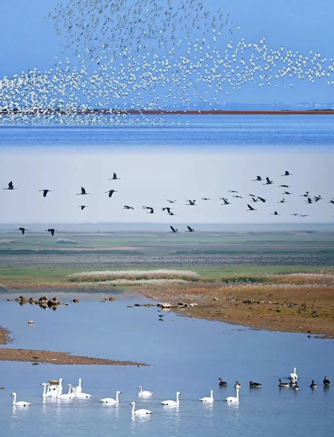 冬季的时候,鄱阳湖堪称鸟类的天堂。成千上万只白鹤、鸿雁、灰鹤在这里聚集成团,起落之间——像云动。