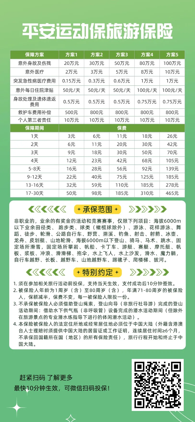 可当天生效,最快投保后10分钟即生效。 1.本保险计划必须在被保险人参加相关旅行活动前投保,支持当天生效,投保支付成功后10分钟签效(暂时仅支持次日生效,系统优化后支持10分钟后生效),保险期间需要覆盖实际旅行活动全程。 2.本计划承保的被保险人年龄为1周岁(含)至80周岁(含),以保单生效时的周岁年龄为准。 3.保供生效时年满71-80周岁的被保险人,其涉及的身故,伤残及医疗费用相关保险的保险全额为上述保障计划中所载保险金额的一半(50%)保险费维持不变。 4.本产品可承保本地非职业的,业余的有奖金的活动和竞赛赛事,且相关活动和赛事仅限承保下列运动项目:海拔6000米以下业余田径类、 跑步类、球类(橄榄球除外)、游泳、花样游泳、舞蹈、徒步、轮滑、公路自行车、野营、溯溪、钓鱼、射击、射箭、冰壶、龙舟、皮划艇、山地轮滑、登山(海拔6000以下)、骑马、马术、跳水、固定场所滑雪,固定场所攀岩、帆船、卡丁车、游艇、赛艇、摩托艇、帆板、浆板、冲浪、滑滑梯、拖伞,水上飞人,水上沙发,滑水、魔力躺,自行车越野、长板、越野车、山地越野车、踢毽子、爬楼梯、拔河的非职业的,业余的活动和竞赛中的意外事故。