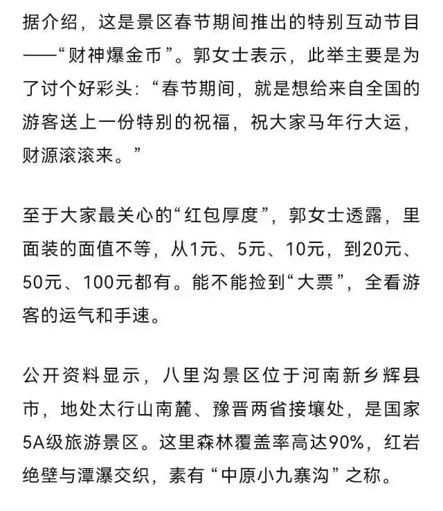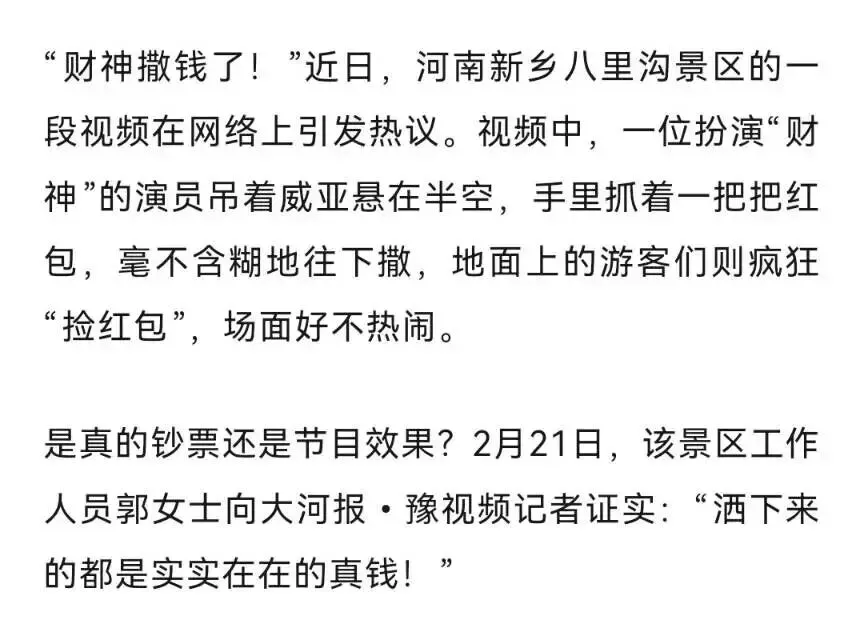 河南一景区“财神”演员在空中撒钱,景区回应:撒下的是“实实在在的真钱”