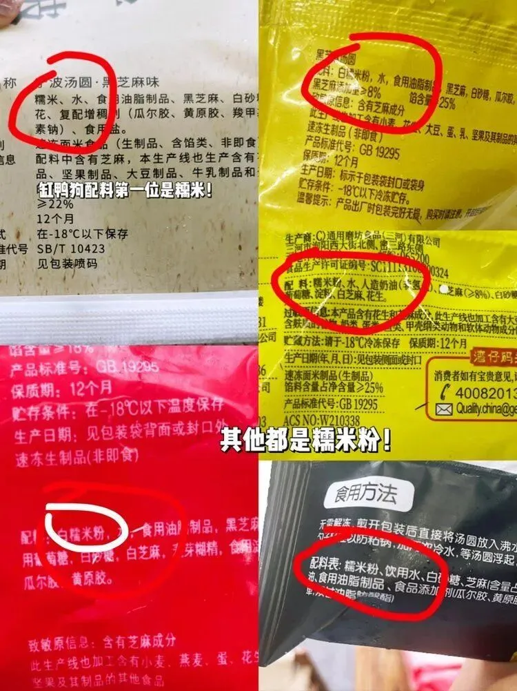 我们选择了市面上几个常见的品牌,看他们配料表,第一项都是糯米粉,唯有缸鸭狗是糯米