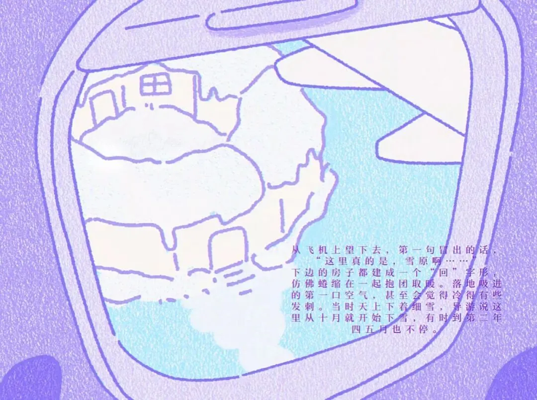 下边的房子都建成一个“回”字形,仿佛蜷缩在一起抱团取暖。落地吸进的第一口空气,甚至会觉得冷得有些发刺。当时天上下着细雪,导游说这里从十月就开始下雪,有时到第二年四五月也不停。