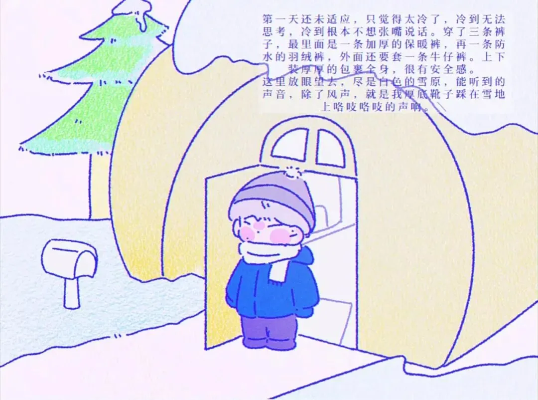 第一天还未适应,只觉得太冷了,冷到无法思考,冷到根本不想张嘴说话。穿了三条裤子,最里面是一条加厚的保暖裤,再一条防水的羽绒裤,外面还要套一条牛仔裤。上下装厚厚的包裹全身,很有安全感。