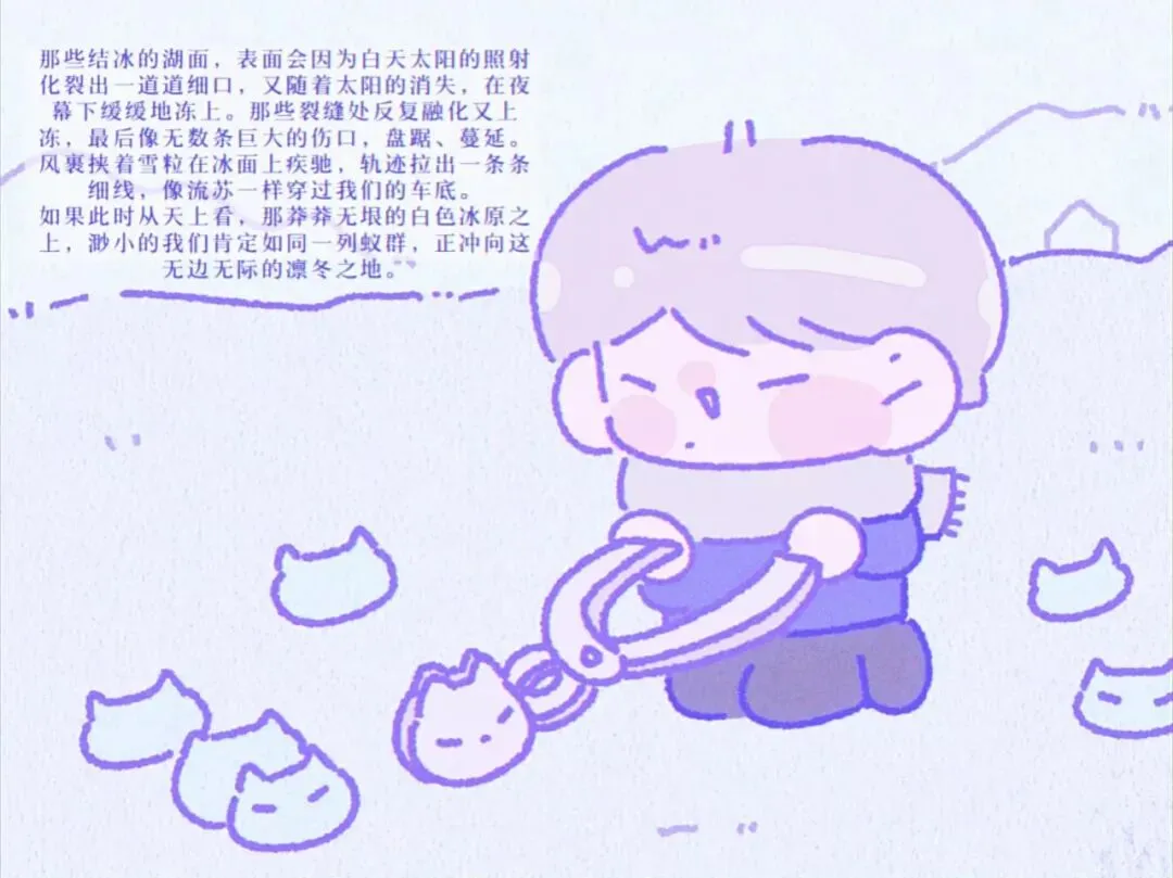 那些结冰的湖面,表面会因为白天太阳的照射化裂出一道道细口,又随着太阳的消失,在夜幕下缓缓地冻上。那些裂缝处反复融化又上冻,最后像无数条巨大的伤口,盘踞、蔓延。风裹挟着雪粒在冰面上疾驰,轨迹拉出一条条细线,像流苏一样穿过我们的车底。