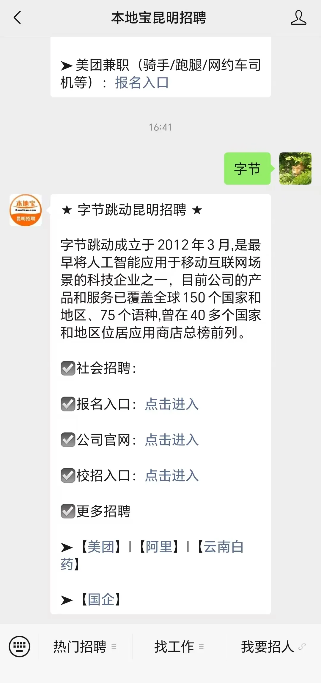 推荐服务:扫描下方二维码关注【本地宝昆明招聘】,关注后对话框回复【字节】可获云南、昆明字节跳动招聘公告,报名入口等相关信息。(本地宝仅提供报名入口,非主办方)