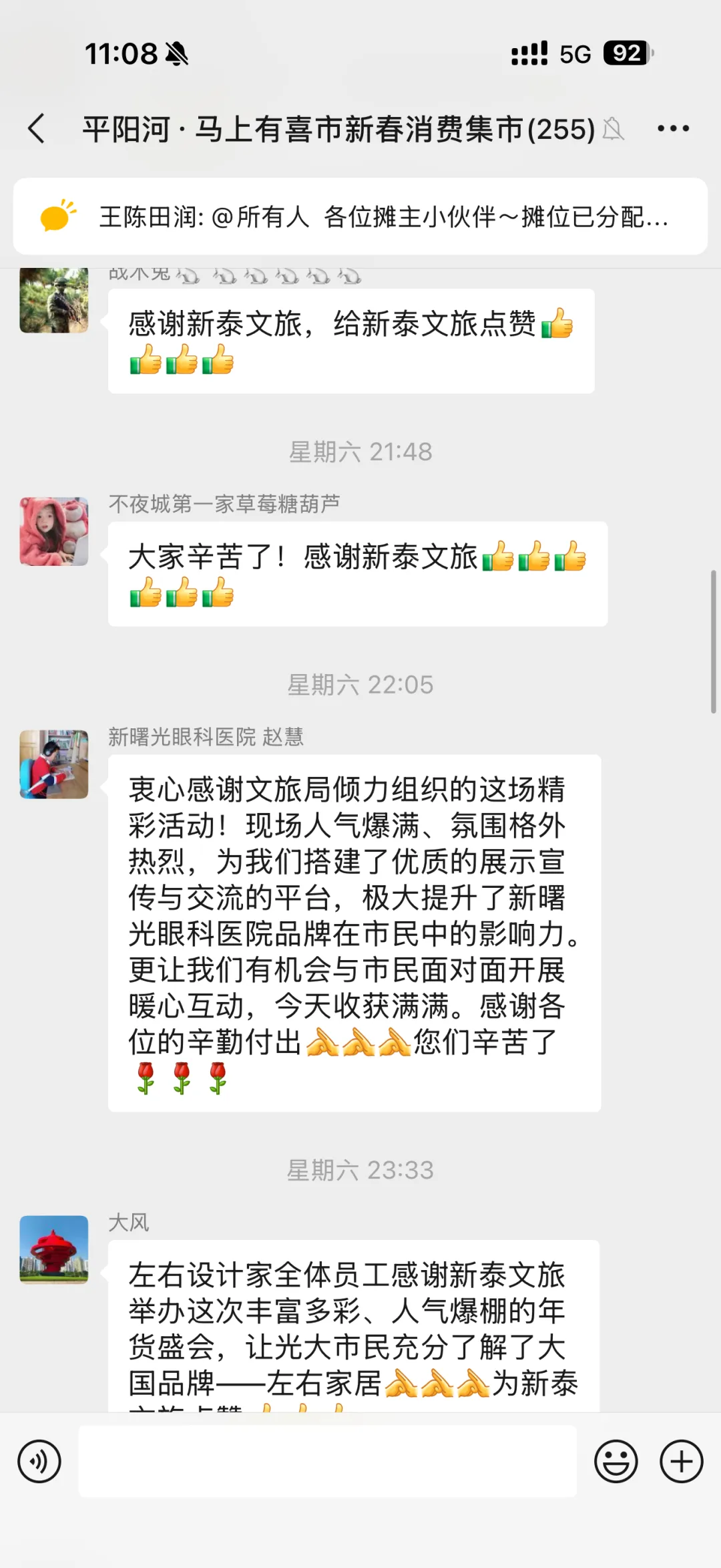 展览展示类活动亮点纷呈。依托三馆、工人文化宫等阵地,举办文旅新泰·非遗文创匠心展、“甲午丹青·翰墨迎春”2026新春贺岁书画艺术展等活动,平阳河公园同步开展“马年纳福”非遗匠心展、“龙马精神”五个城市图片展等展览,集中展示城市发展成果、非遗魅力和传统记忆,累计接待参观群众45万余人次。文艺演出类活动丰富多彩。统筹商圈、社区、广场等场地,组织吾悦广场“春节七天乐”、青云街道文艺联欢晚会等系列演出,涵盖舞狮巡游、民俗杂技、戏曲表演等多种形式,其中青云街道15场文艺汇演覆盖群众5万余人次;龙廷镇、东都镇、西张庄镇、放城镇、宫里镇、果都镇等乡镇同步开展文艺演出、民俗展演等活动,丰富群众节日文化生活。惠民体验类活动贴近群众。推出全家福公益摄影、非遗体验工坊等惠民活动,在景区及商圈设置摄影点,为群众免费拍摄全家福;工人文化宫举办首届俺家新泰·新春非遗体验工坊展,汇集新泰387项非遗资源,线上主题直播间同步开售,凸显“非遗+消费”模式活力。同时,市文博图三馆、毛泽东文献博物馆等全部免费开放,为群众提供便捷的文化服务。