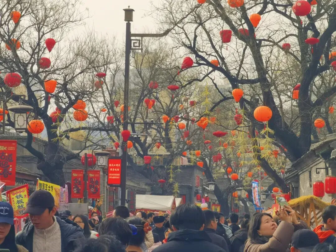 白日里的模式口大街,无法欣赏灯光闪烁的美景,但美食飘香、繁华热闹,炸糕店依然是排了长长的队伍,商贩的叫卖声,游客的谈笑声,各种彩色的年画与装饰,像是沸腾着烟火人声的民俗画卷,这便是京城的年味。