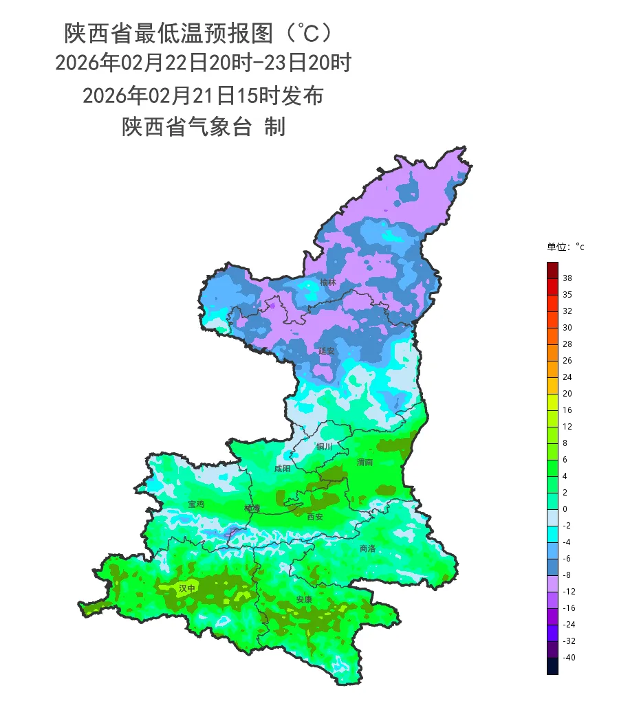 受寒潮影响,预计2026年2月21日20时至2月23日20时,过程降温全省大部下降6~8℃,榆林大部、延安大部、秦岭山区下降8~10℃,其中延安局地(宝塔区、安塞区、宜川县、子长市、延川县)、秦岭山区(长安区、鄠邑区、太白县、蓝田县、周至县、华州区、华阴市、潼关县、商州区、洛南县、柞水县、丹凤县、商南县、白河县)可达10℃以上(图1)。预计最低气温陕北出现在2月23日清晨,关中、陕南地区出现在24日清晨,最低气温:陕北北部、秦岭山区-10~-6℃,关中北部、陕北南部-4~0℃,关中南部、商洛0~3℃,汉中、安康2~5℃(图2、图3)。