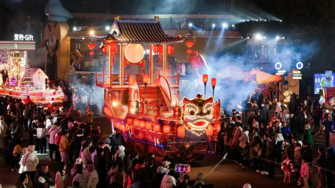 武汉欢乐谷夜光巡游精彩上演,飞天鳌鱼、光影彩车飘雪与NPC互动,年味拉满