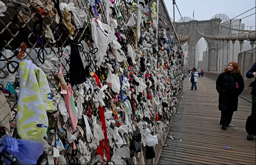 在布鲁克林大桥上悬挂“爱情锁”,导致桥栏杆不堪重负,甚至出现坍塌的风险。