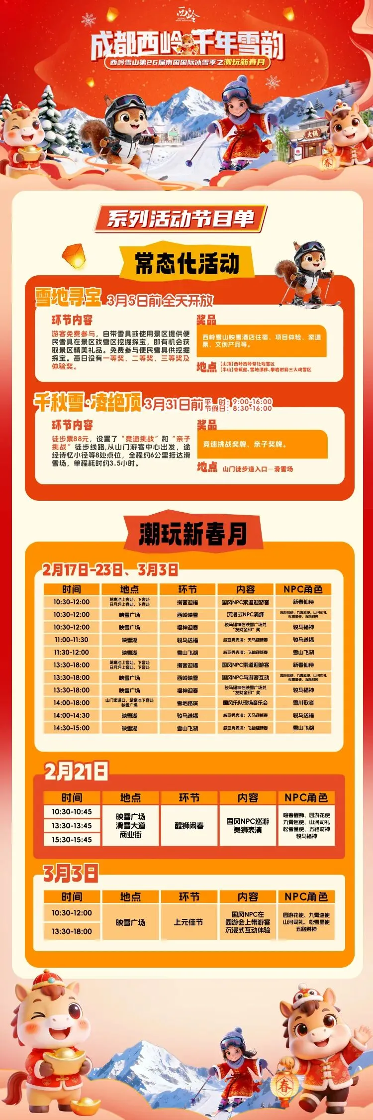 春节期间(2月15日至3月3日)西岭雪山景区营业时间如下: