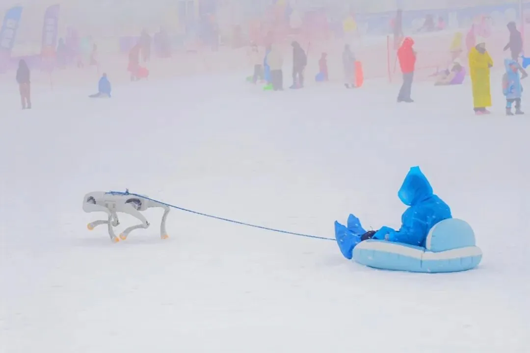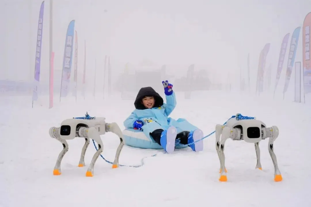 现场还有“机器狗拉雪橇”项目免费供游客游玩。该项目以“旅游+科技”融合创新,为游客带来突破传统的冰雪体验。