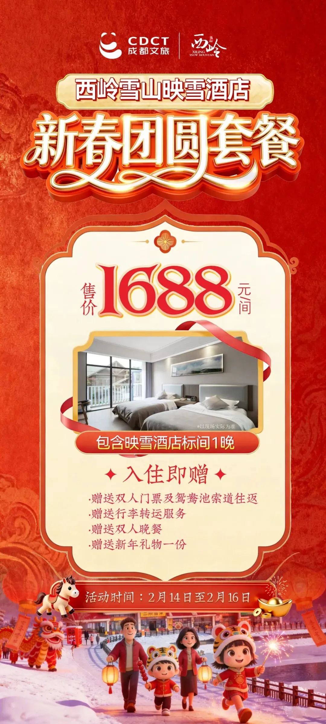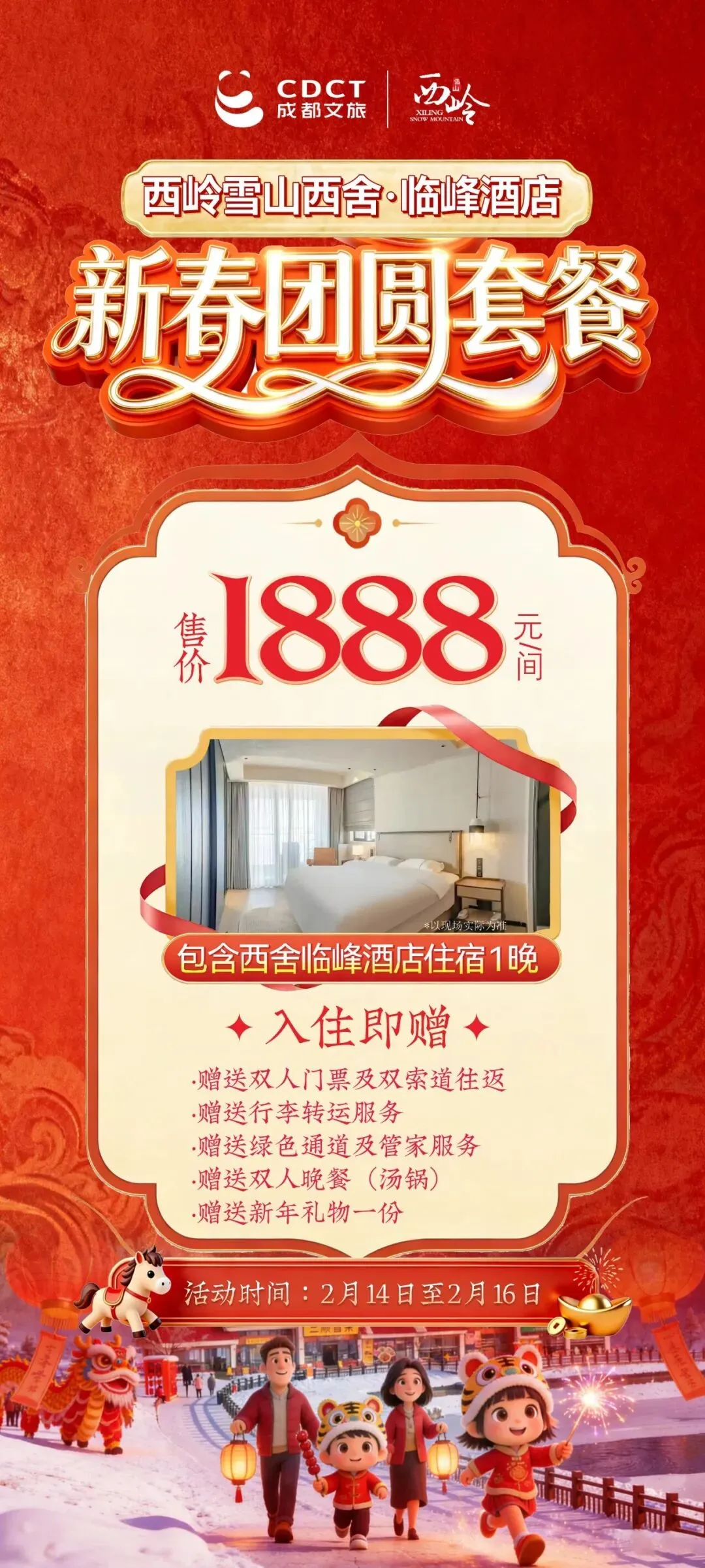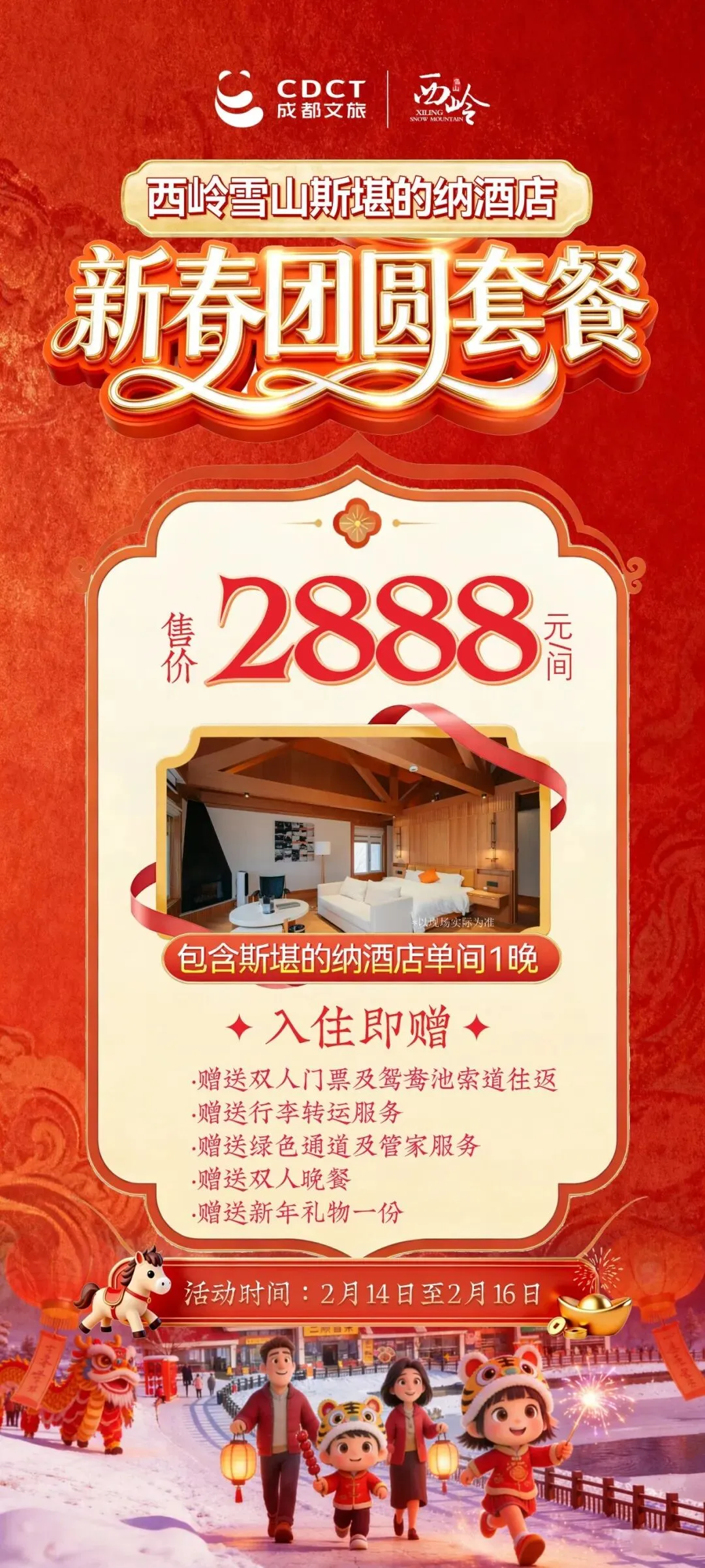 玩得尽兴,也要住得舒心!西岭雪山旗下三大酒店同步推出 “新春团圆套餐”,仅限 2月14日—2月16日 入住,一站全含,轻松过年!