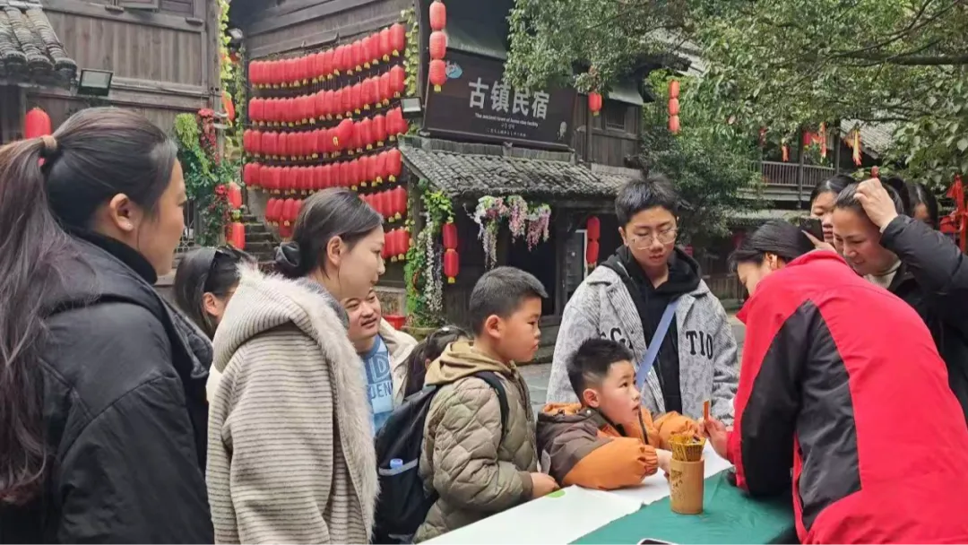 大觉古镇里,天官巡游送福、大觉钱庄银票互动、新春拍卖会等游园活动趣味十足,古色古香中满是新春热闹。