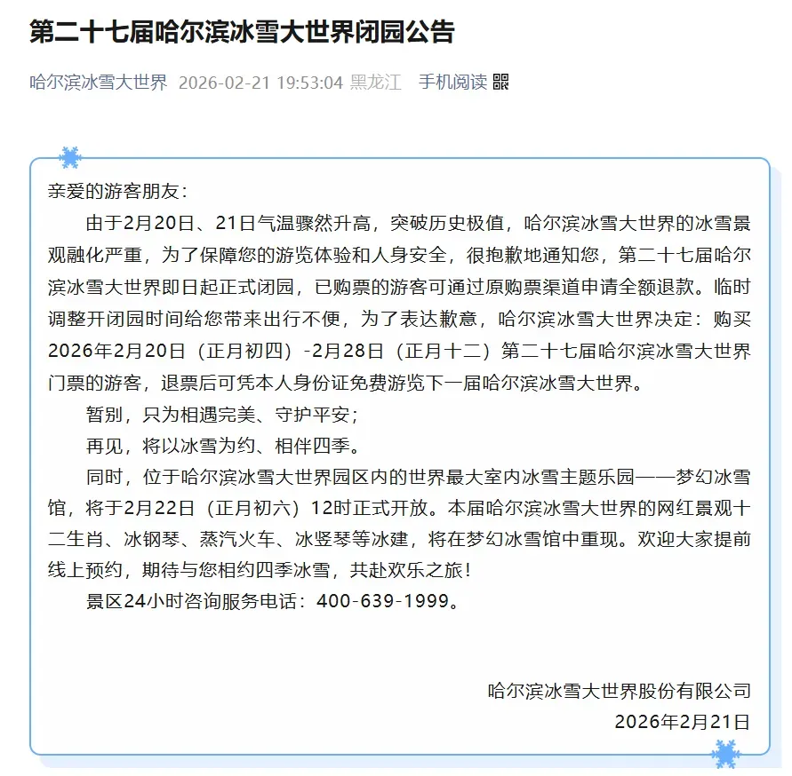 刚刚,哈尔滨冰雪大世界发布公告:由于2月20日、21日气温骤然升高,突破历史极值,冰雪景观融化严重,第二十七届哈尔滨冰雪大世界即日起正式闭园,已购票的游客可通过原购票渠道申请全额退款。