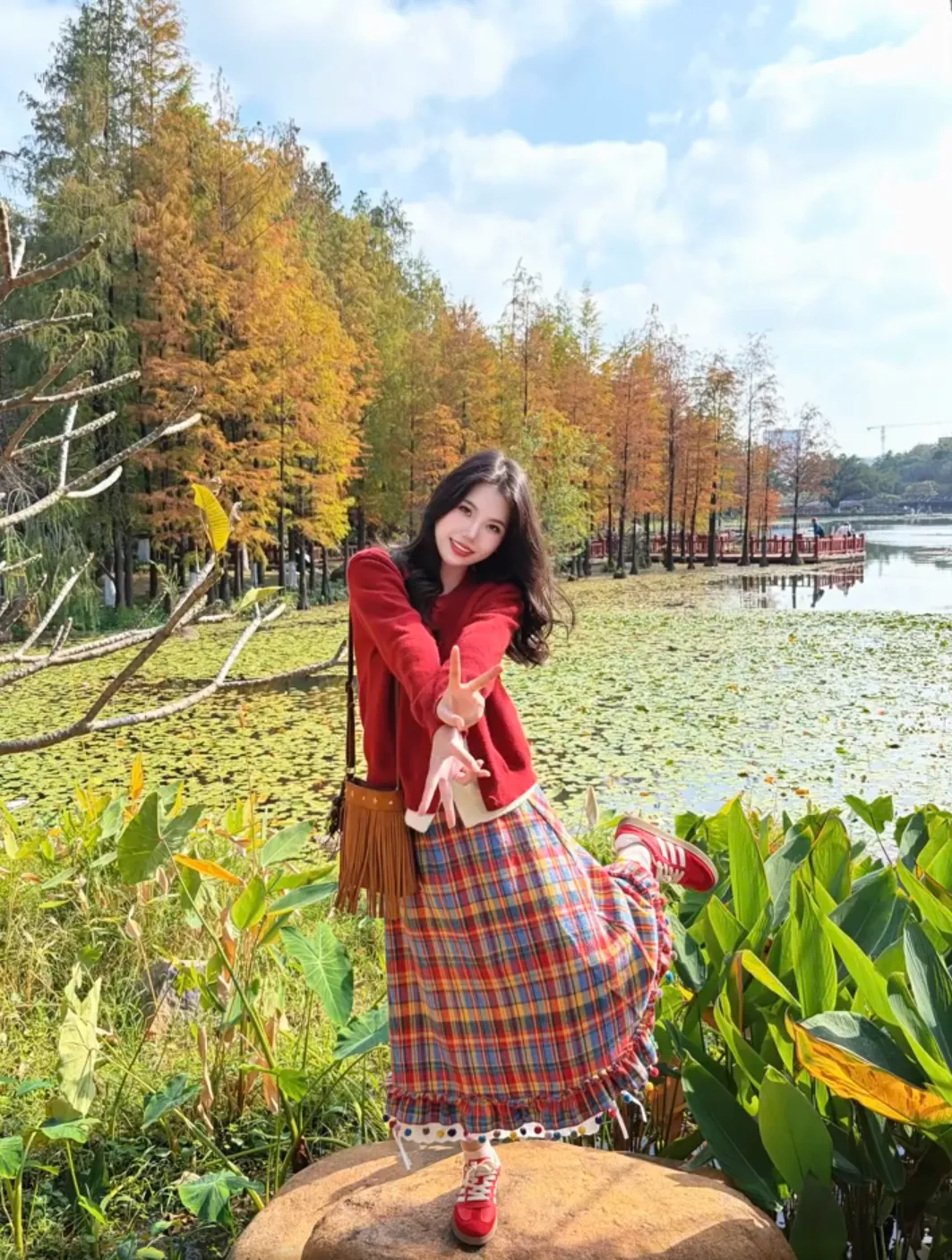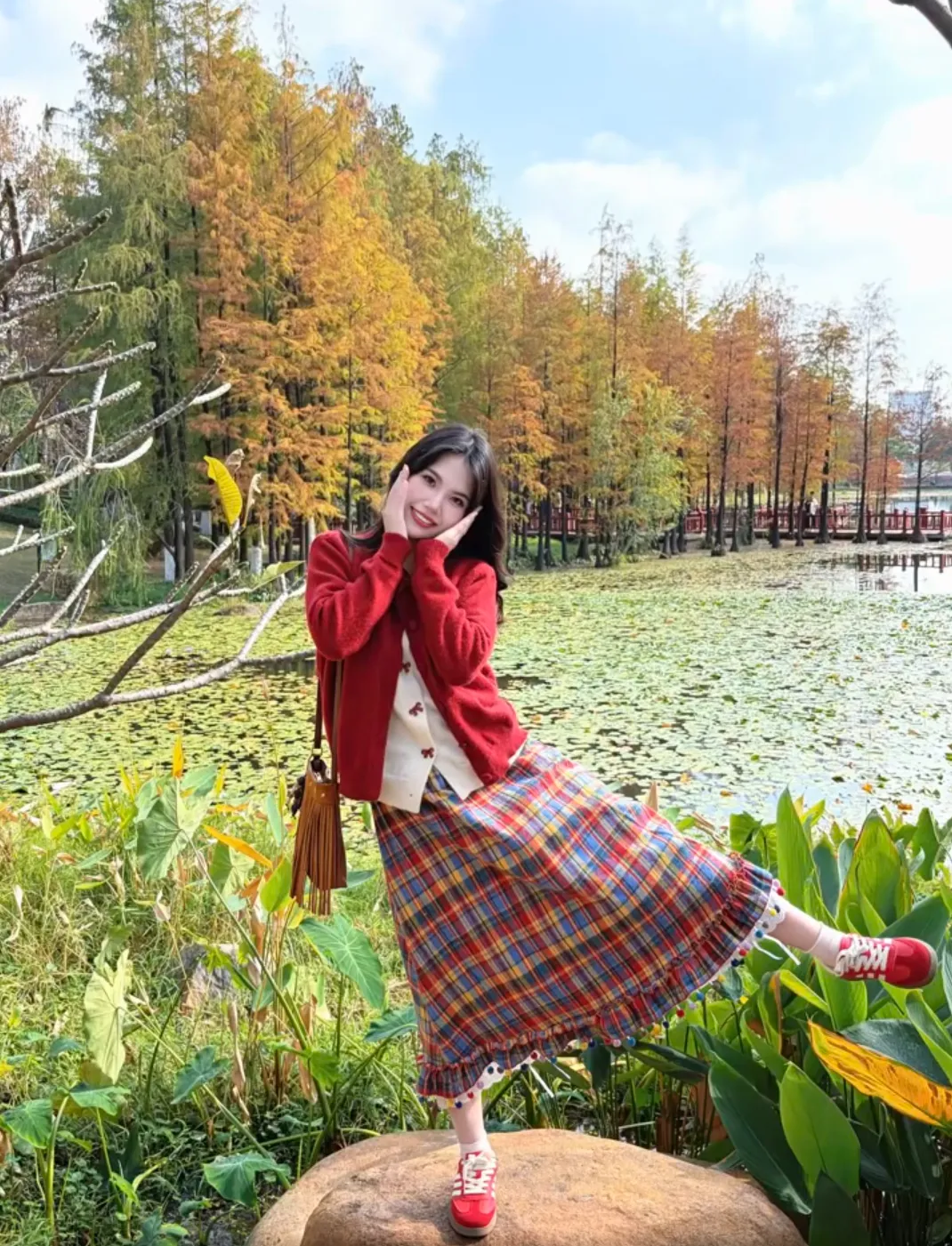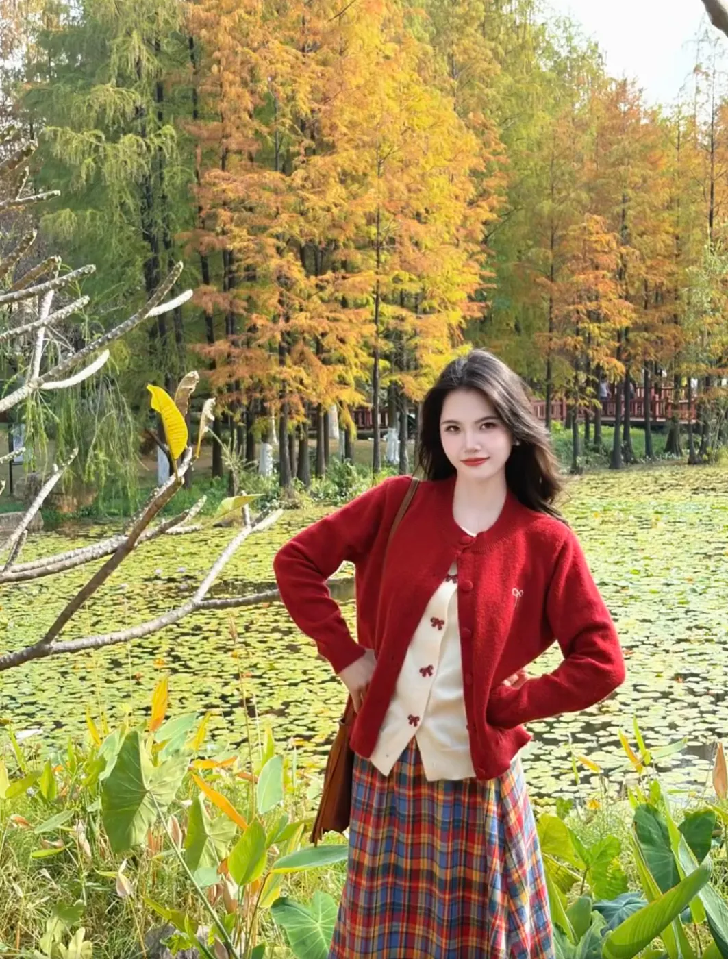 旅行拍照中双手拿包本身就很自然,再加一个侧踢一条腿的小动作,整个人就不会显得站得太直,这种拍照动作很适合街头或者景点空地,拍出来的照片看着随意但很出片。