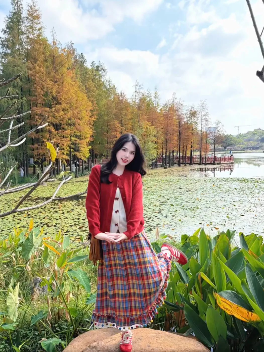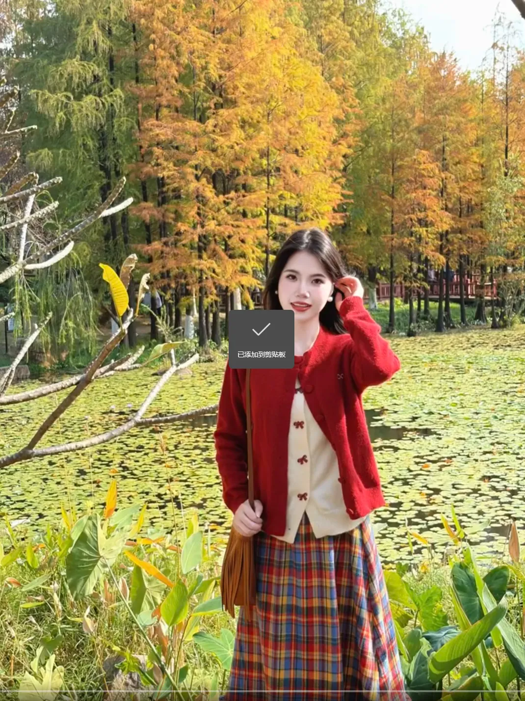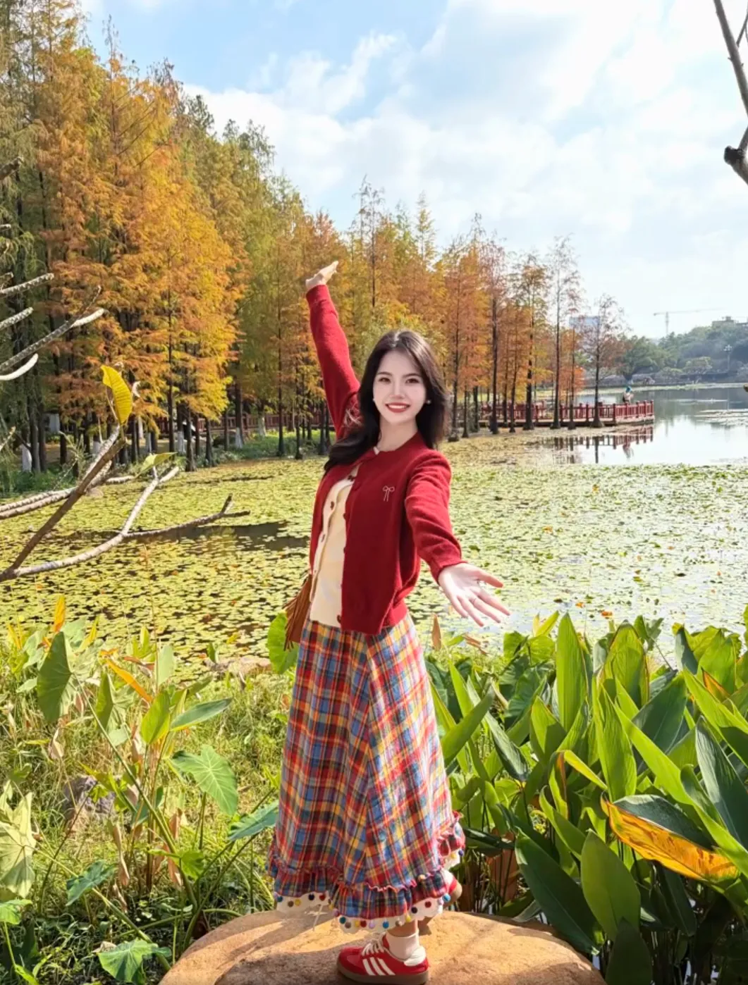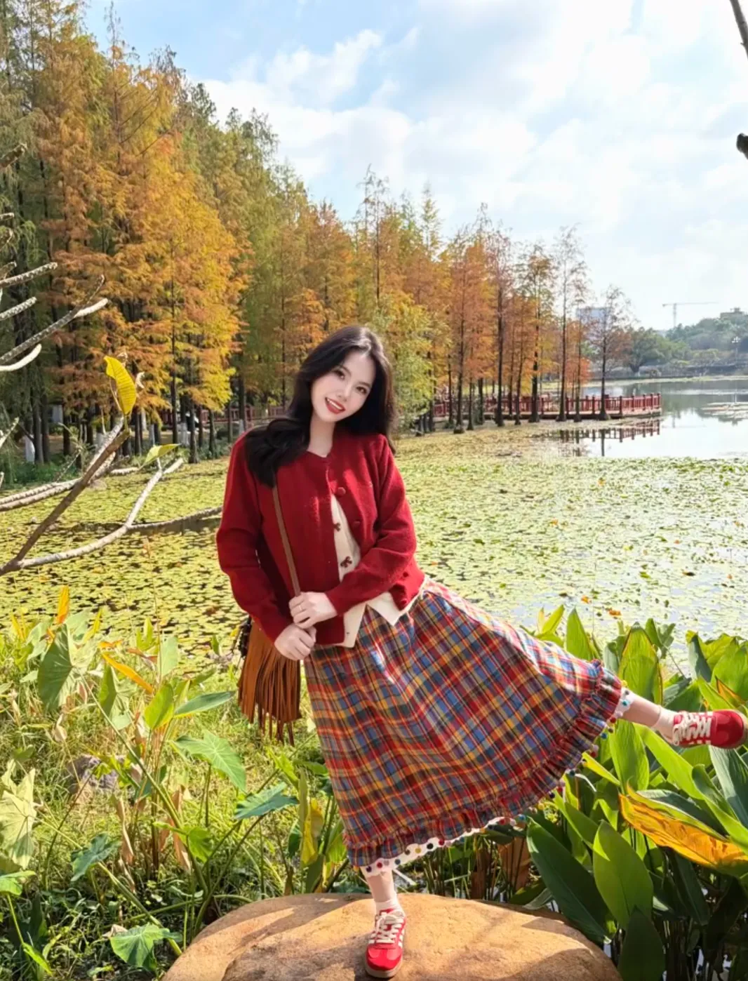 旅行拍照中双手拿包本身就很自然,再加一个侧踢一条腿的小动作,整个人就不会显得站得太直,这种拍照动作很适合街头或者景点空地,拍出来的照片看着随意但很出片。