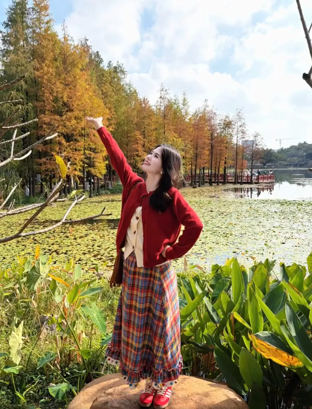 旅游拍照想让画面更有力量感,可以一只手叉腰,另一只手向上举起,这样的拍照姿势会让身体看起来更挺拔,不管是在城市街道还是户外景点,都很容易拍得好看。