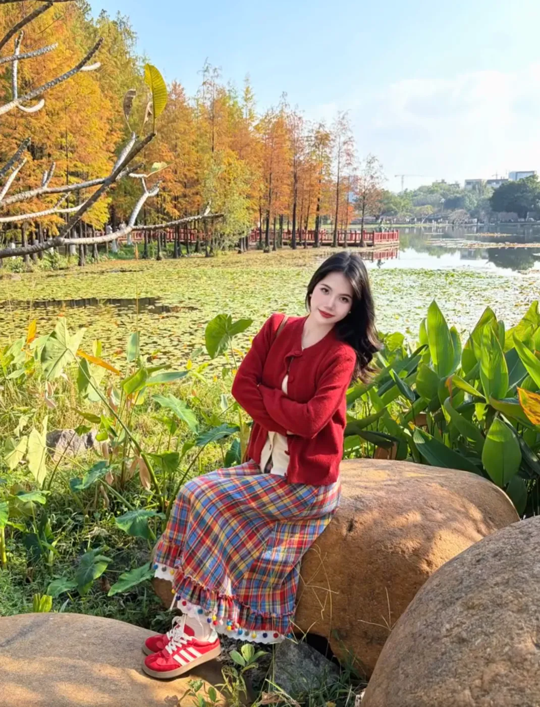 旅游拍照如果有可以坐下的地方,可以侧坐下来,双手自然环抱身体,再回头看镜头笑,这个拍照姿势画面感很强,看起来像是在安静享受旅行时刻。