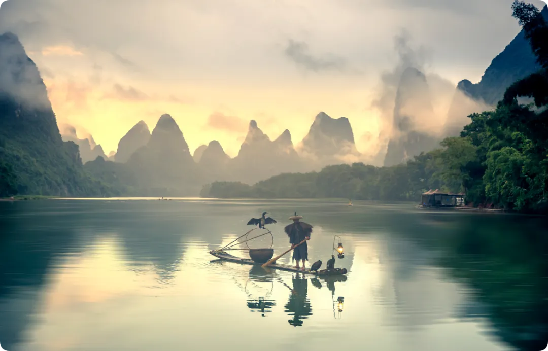 拍摄漓江风光时,可以尝试使用长焦镜头压缩景深,让山水更加紧凑、有层次感。