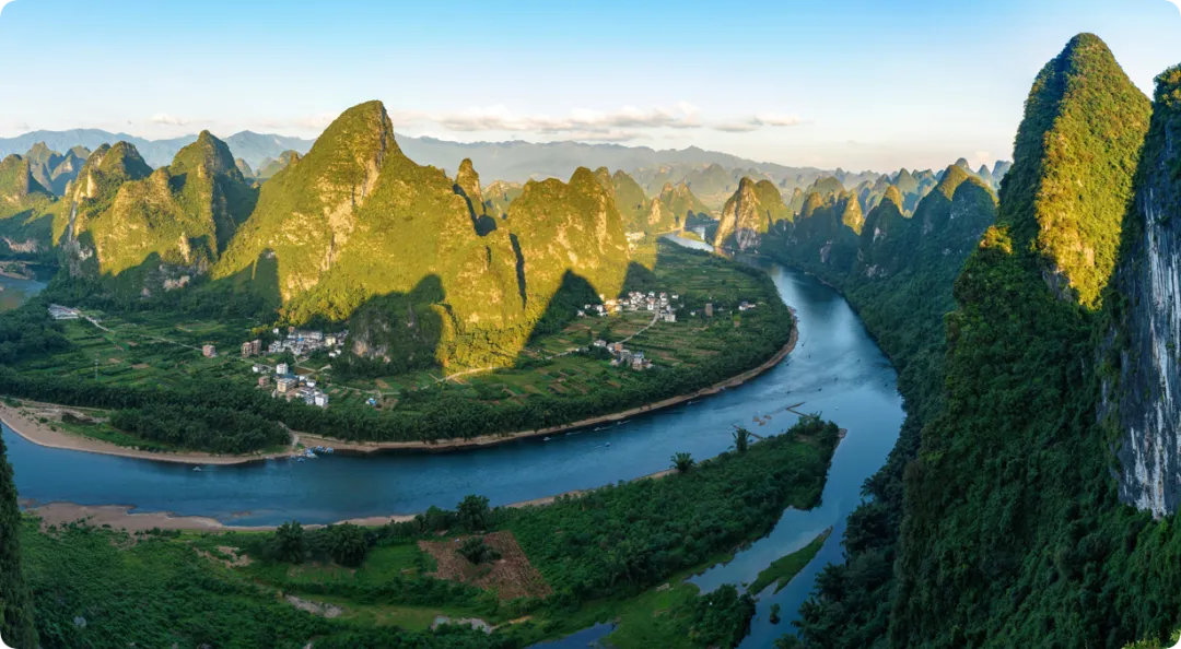 漓江,是桂林山水的代表。乘坐竹筏或游船,沿途可以欣赏到黄布滩、九马画山等著名景点。两岸的山峰倒映在碧绿的江水中,仿佛一幅幅流动的山水画。