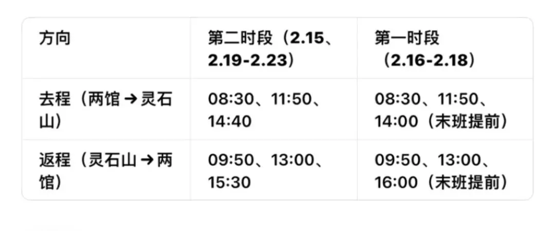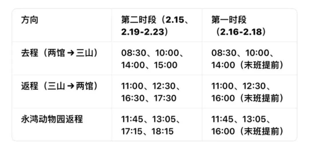 2. 元宵灯会接驳提示:目前直通车暂未覆盖2月26日起的元宵灯会展区,建议灯会期间选择公共交通或步行前往。