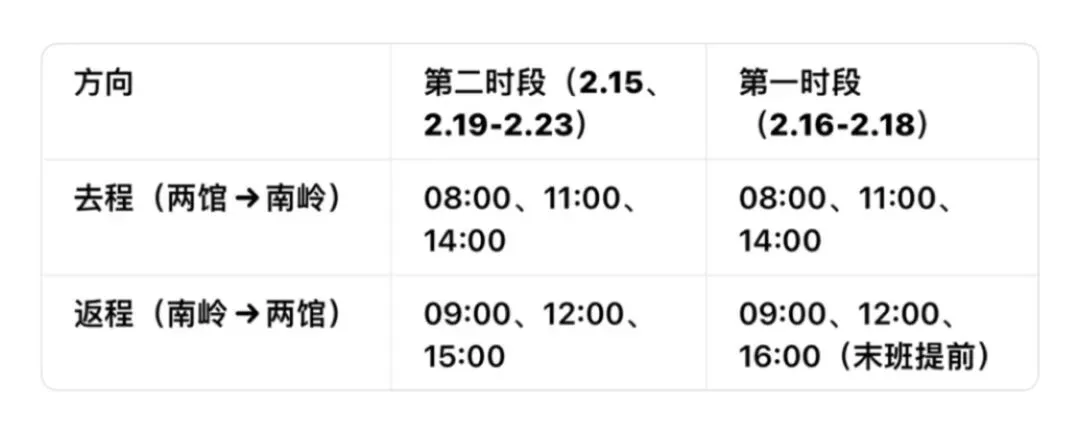 ◦ 2月16日—2月18日(除夕至初二):所有线路末班发车时间为16:00,逾时无车。