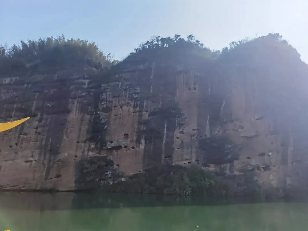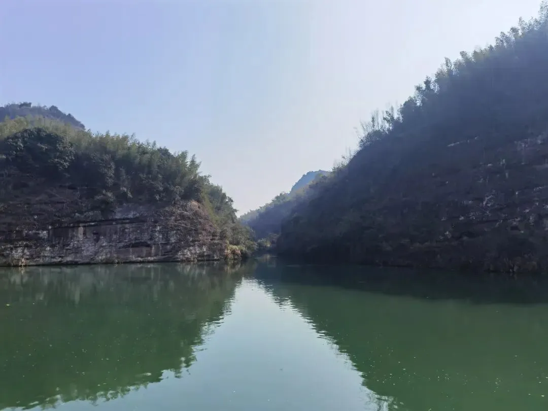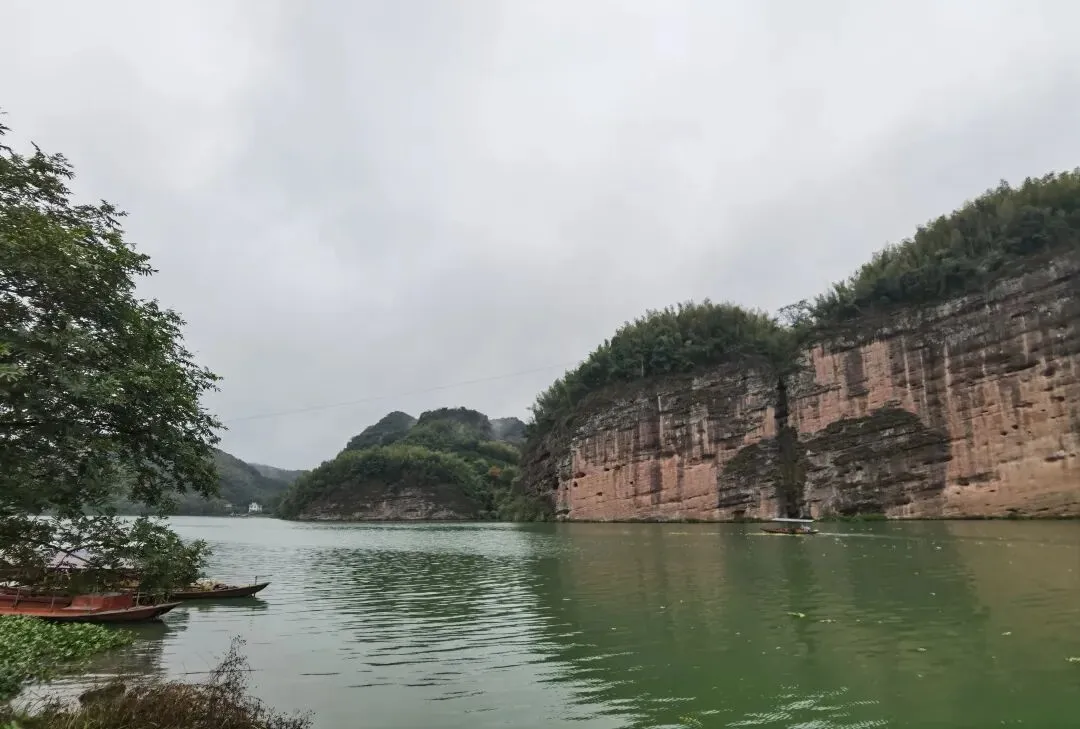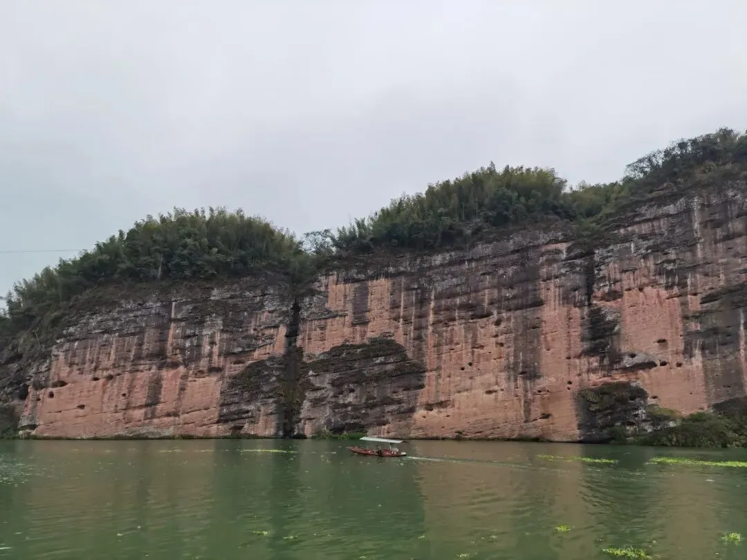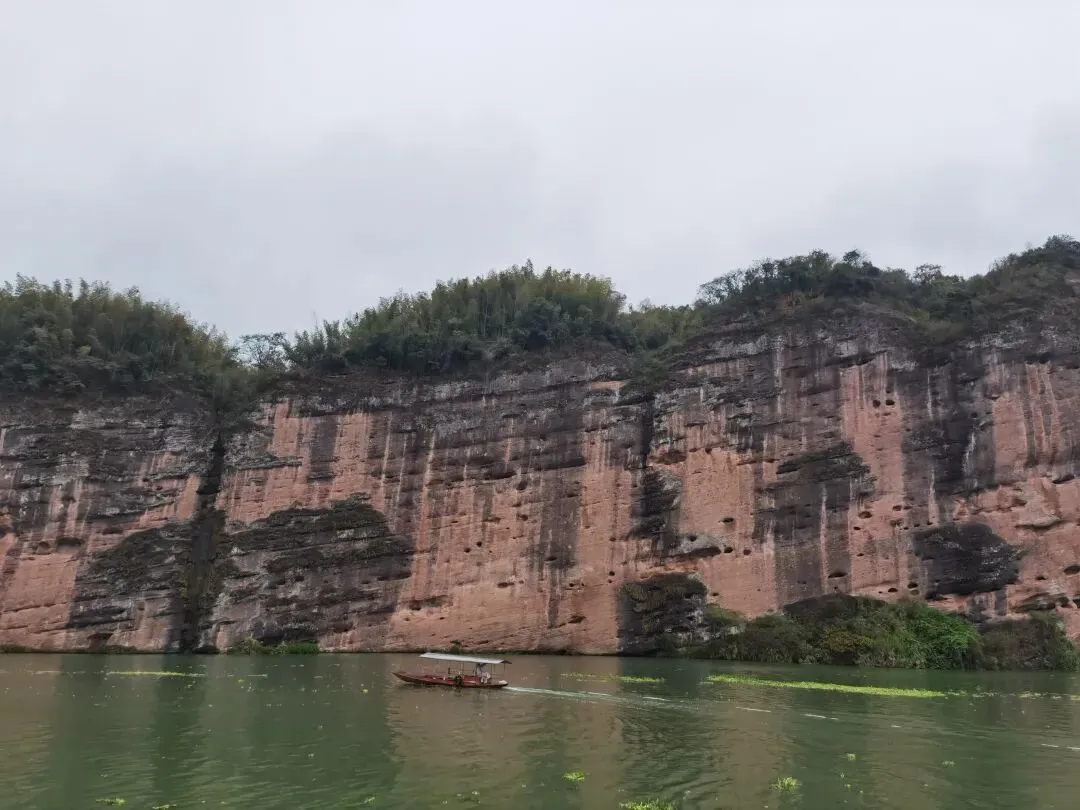 更妙的是赤壁与江水的相依之景。碧绿的便江如一条绸带环绕岩壁,山影倒映水中,随波晃动,构成“船在水中游,人在画中坐”的诗意画面。偶有渔舟轻划而过,桨声惊起水鸟,打破江面的宁静,与岩壁的静默形成动静相宜的和谐。据同行专家考证,此处丹霞地貌形成于中生代侏罗纪至新生代第三纪,岩层中藏着地球演化的密码,而临江岩壁上的天然洞穴与纹路,更引发人们对古代先民生活的遐想。